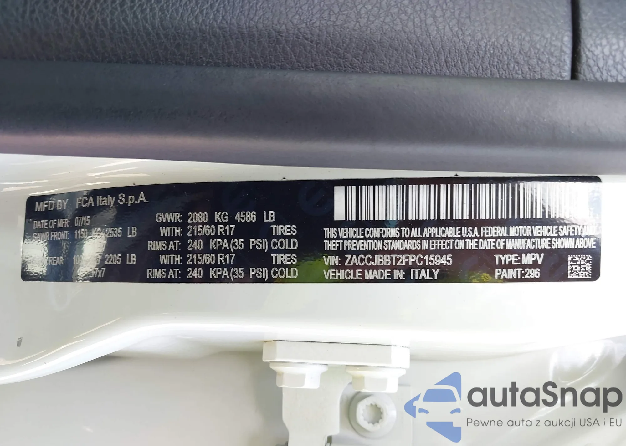 Автомобиль Jeep Renegade 2015 (VIN ZACCJBBT2FPC15945) ранее не участвовал в торгах. Документы чистые, пробег соответствует или ниже среднего по рынку. Продаётся страховой компанией — рекомендуем покупку. Доставка в порт займет около 6–8 недель.