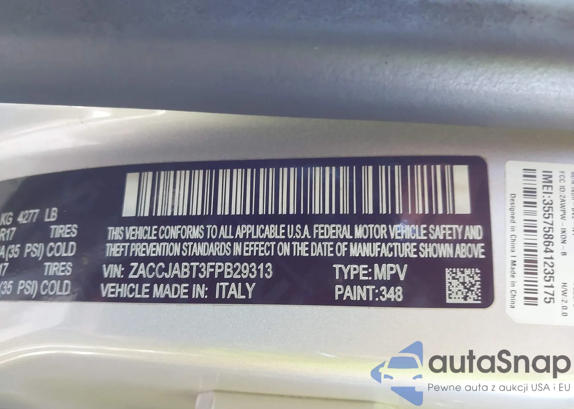 Автомобиль Jeep Renegade 2015 (VIN ZACCJABT3FPB29313) имеет документы, препятствующие регистрации. Могут возникнуть сложности при экспорте и регистрации. Обратитесь к экспертам AutaSnap для поиска альтернатив.