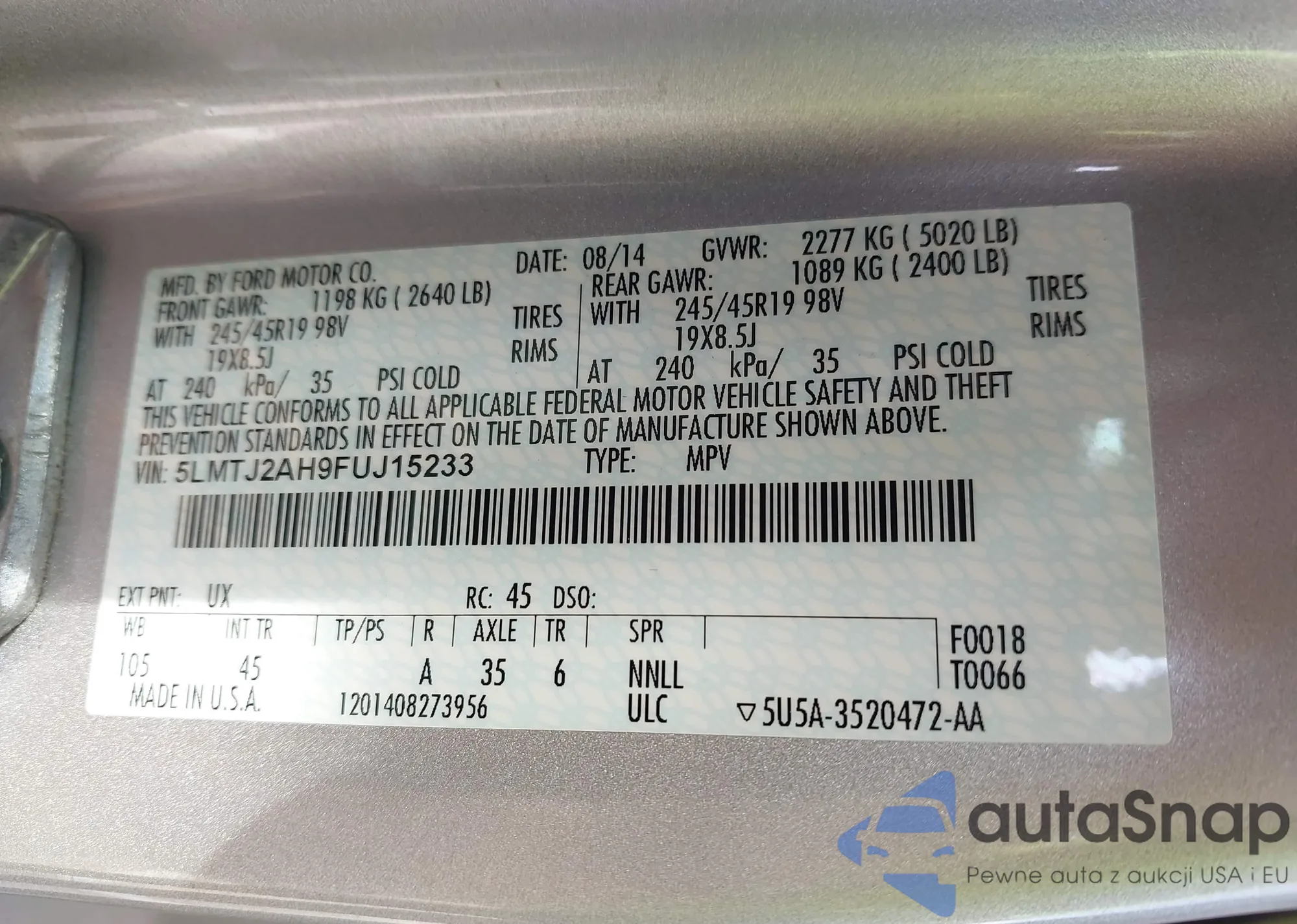 Автомобиль Lincoln MKC 2015 (VIN 5LMTJ2AH9FUJ15233) ранее не участвовал в торгах. Документы чистые, пробег соответствует или ниже среднего по рынку. Продаётся страховой компанией — рекомендуем покупку. Доставка в порт займет около 6–8 недель.