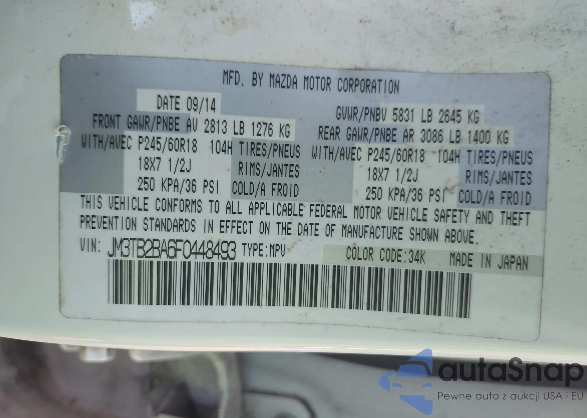 Автомобиль Mazda CX-9 2015 (VIN JM3TB2BA6F0448493) ранее не участвовал в торгах. Документы чистые, пробег соответствует или ниже среднего по рынку. Продаётся страховой компанией — рекомендуем покупку. Доставка в порт займет около 6–8 недель.