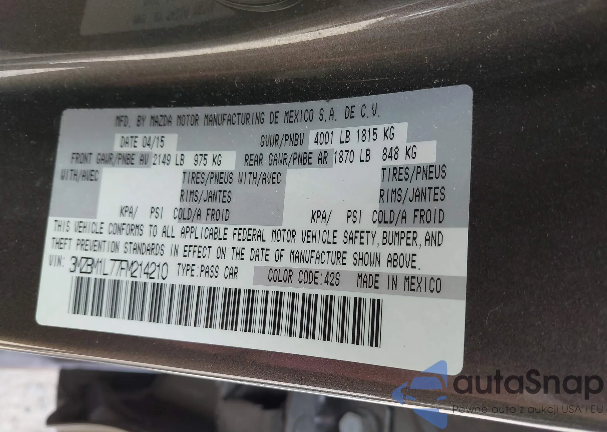 VIN: 3MZBM1L77FM214210