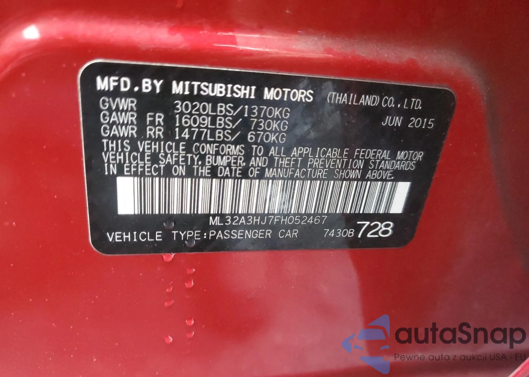 Автомобиль Mitsubishi Mirage 2015 (VIN ML32A3HJ7FH052467) ранее не участвовал в торгах. Документы чистые, пробег соответствует или ниже среднего по рынку. Продаётся страховой компанией — рекомендуем покупку. Доставка в порт займет около 6–8 недель.