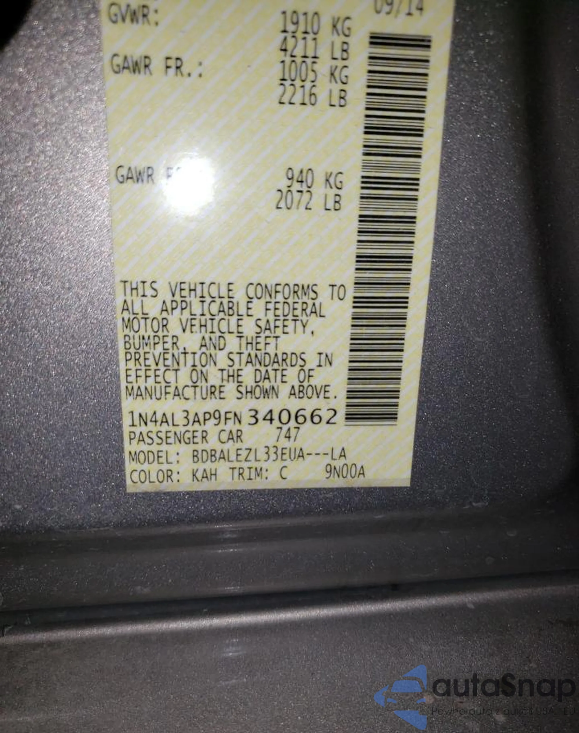 • VIN: 1N4AL3AP9FN340662