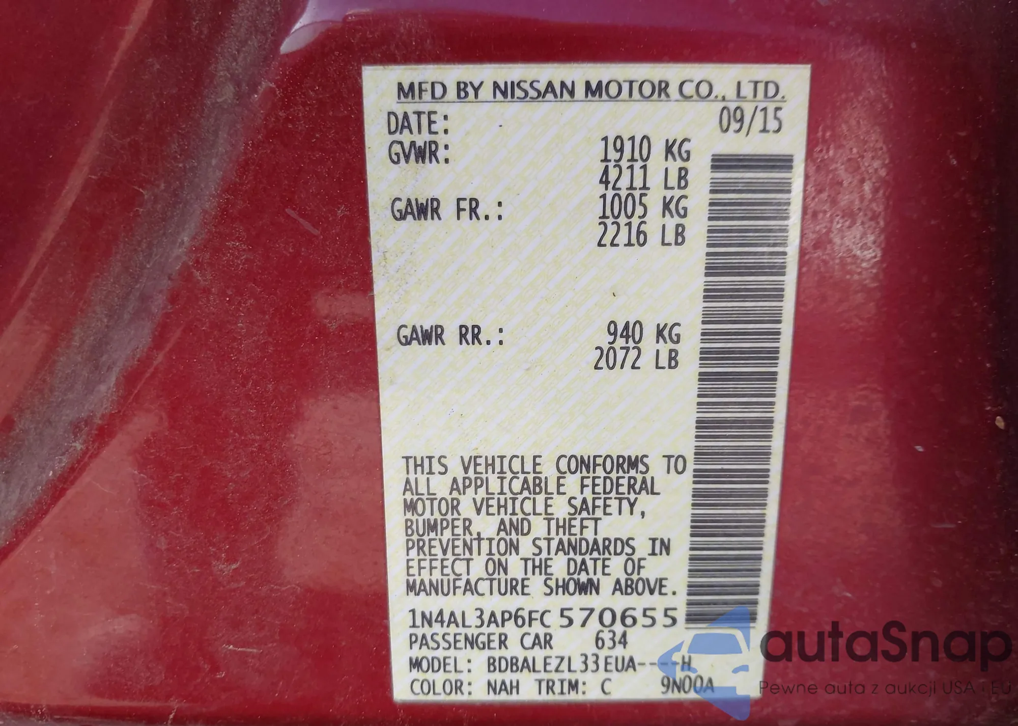 Автомобиль Nissan Altima 2015 (VIN 1N4AL3AP6FC570655) ранее не участвовал в торгах. Документы чистые, пробег соответствует или ниже среднего по рынку. Продаётся страховой компанией — рекомендуем покупку. Доставка в порт займет около 6–8 недель.