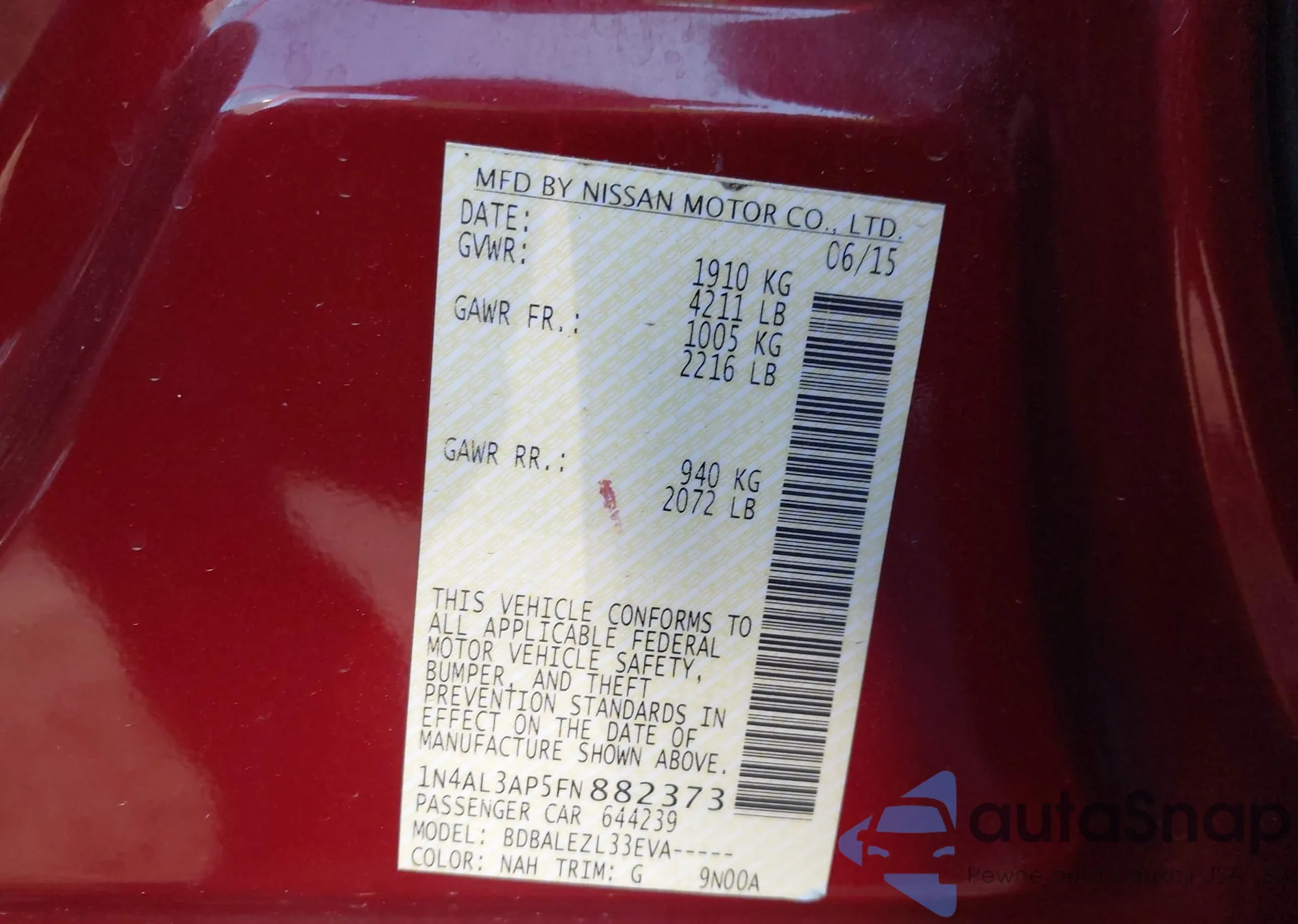 Автомобиль Nissan Altima 2015 (VIN 1N4AL3AP5FN882373) ранее не участвовал в торгах. Документы чистые, пробег соответствует или ниже среднего по рынку. Продаётся страховой компанией — рекомендуем покупку. Доставка в порт займет около 6–8 недель.