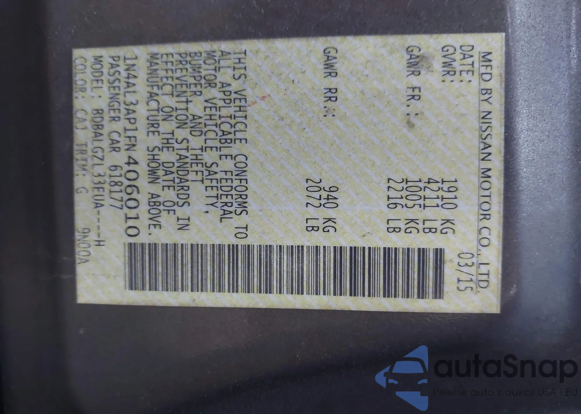 Автомобиль Nissan Altima 2015 (VIN 1N4AL3AP1FN406010) ранее не участвовал в торгах. Документы чистые, пробег соответствует или ниже среднего по рынку. Продаётся страховой компанией — рекомендуем покупку. Доставка в порт займет около 6–8 недель.