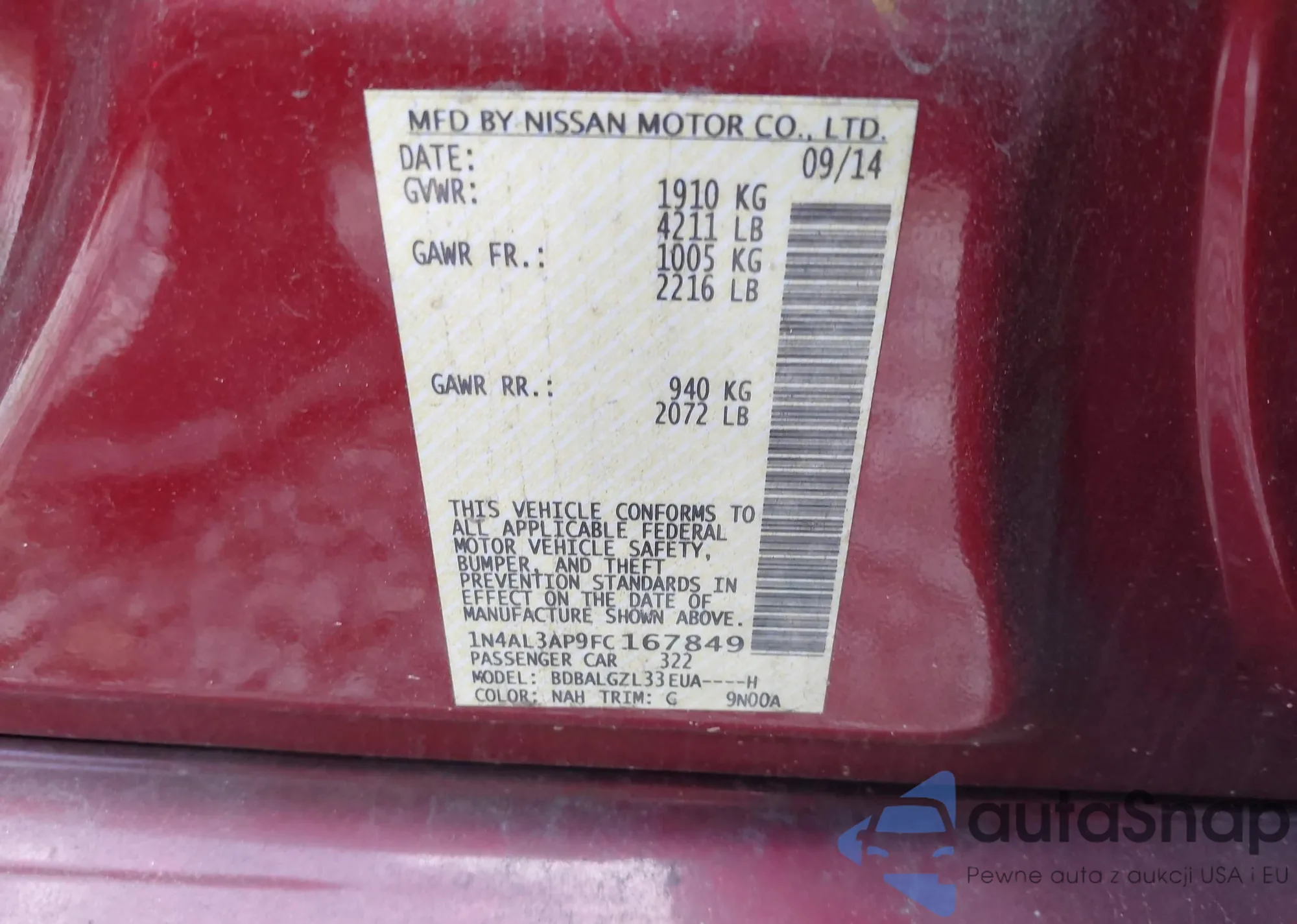 • VIN: 1N4AL3AP9FC167849