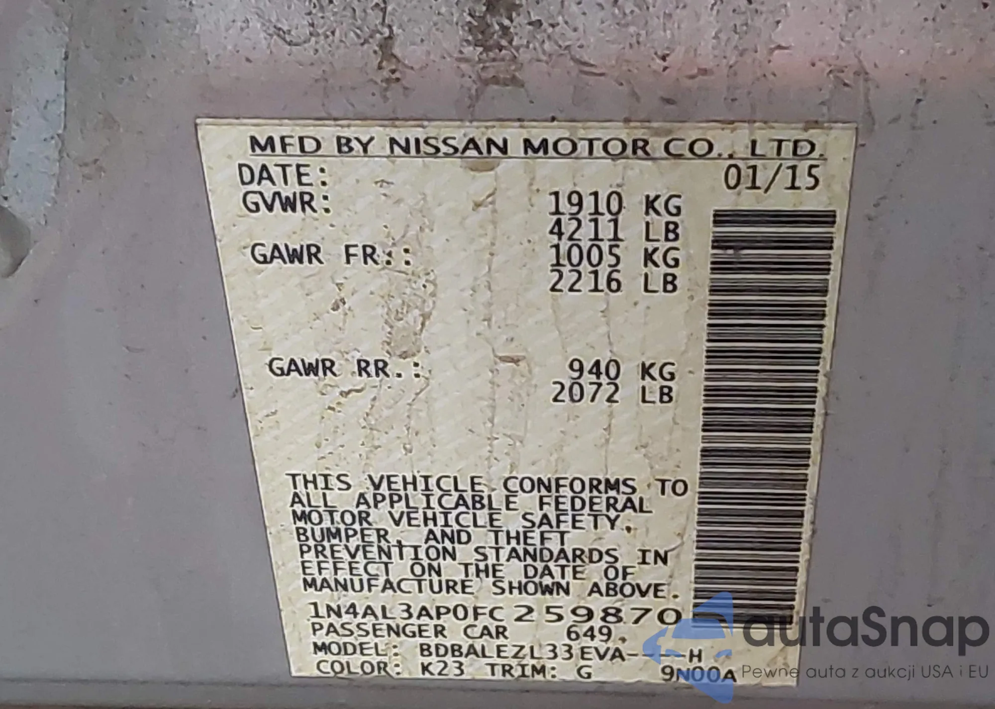 Автомобиль Nissan Altima 2015 (VIN 1N4AL3AP0FC259870) имеет документы, препятствующие регистрации. Могут возникнуть сложности при экспорте и регистрации. Обратитесь к экспертам AutaSnap для поиска альтернатив.