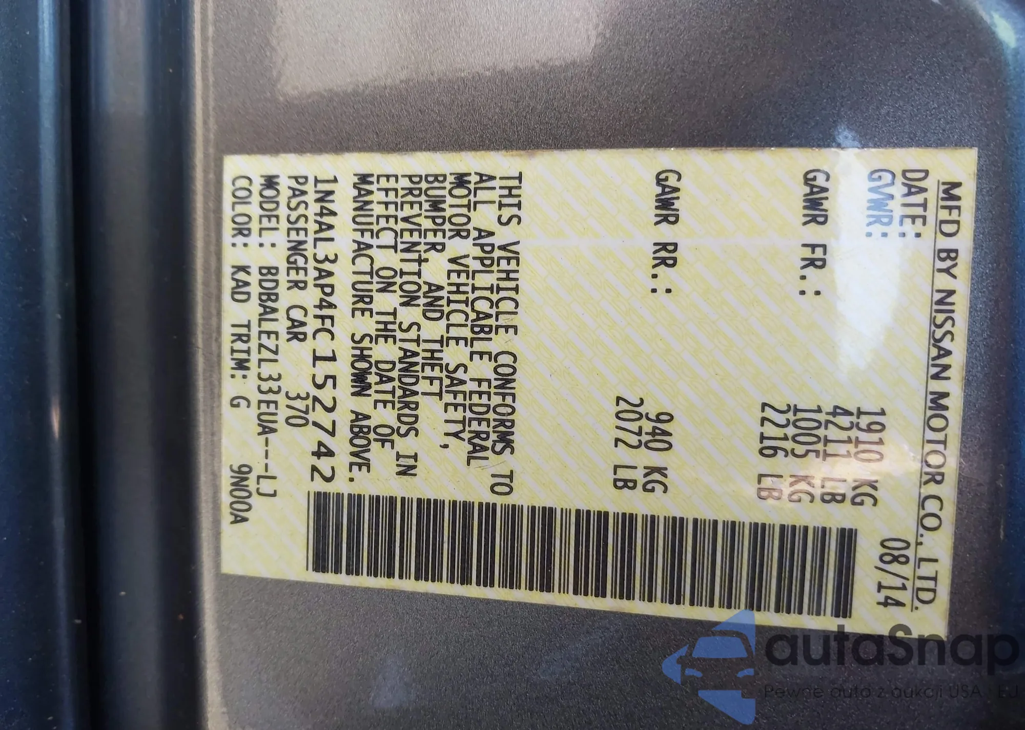 Автомобиль Nissan Altima 2015 (VIN 1N4AL3AP4FC152742) ранее не участвовал в торгах. Документы чистые, пробег соответствует или ниже среднего по рынку. Продаётся страховой компанией — рекомендуем покупку. Доставка в порт займет около 6–8 недель.