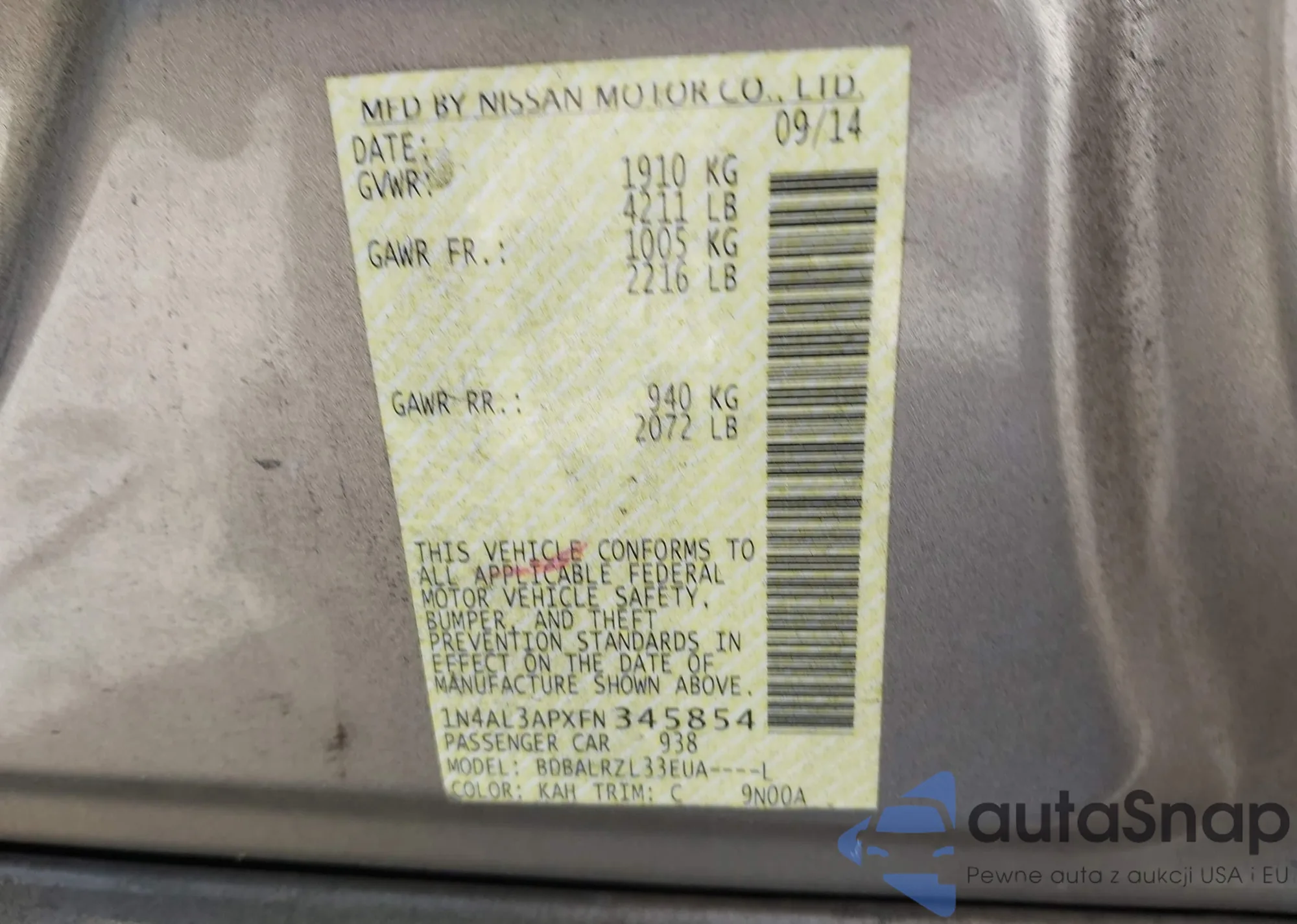 • VIN: 1N4AL3APXFN345854