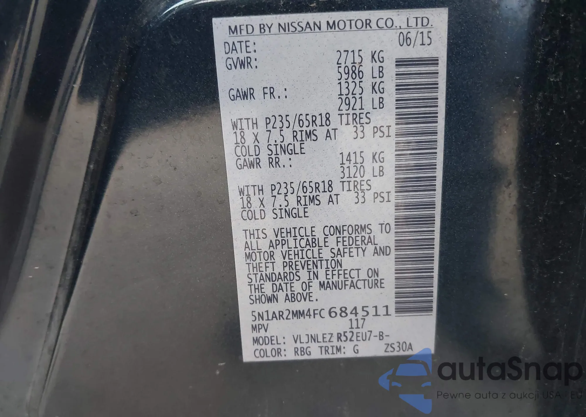 Автомобиль Nissan Pathfinder 2015 (VIN 5N1AR2MM4FC684511) имеет документы, препятствующие регистрации. Могут возникнуть сложности при экспорте и регистрации. Обратитесь к экспертам AutaSnap для поиска альтернатив.