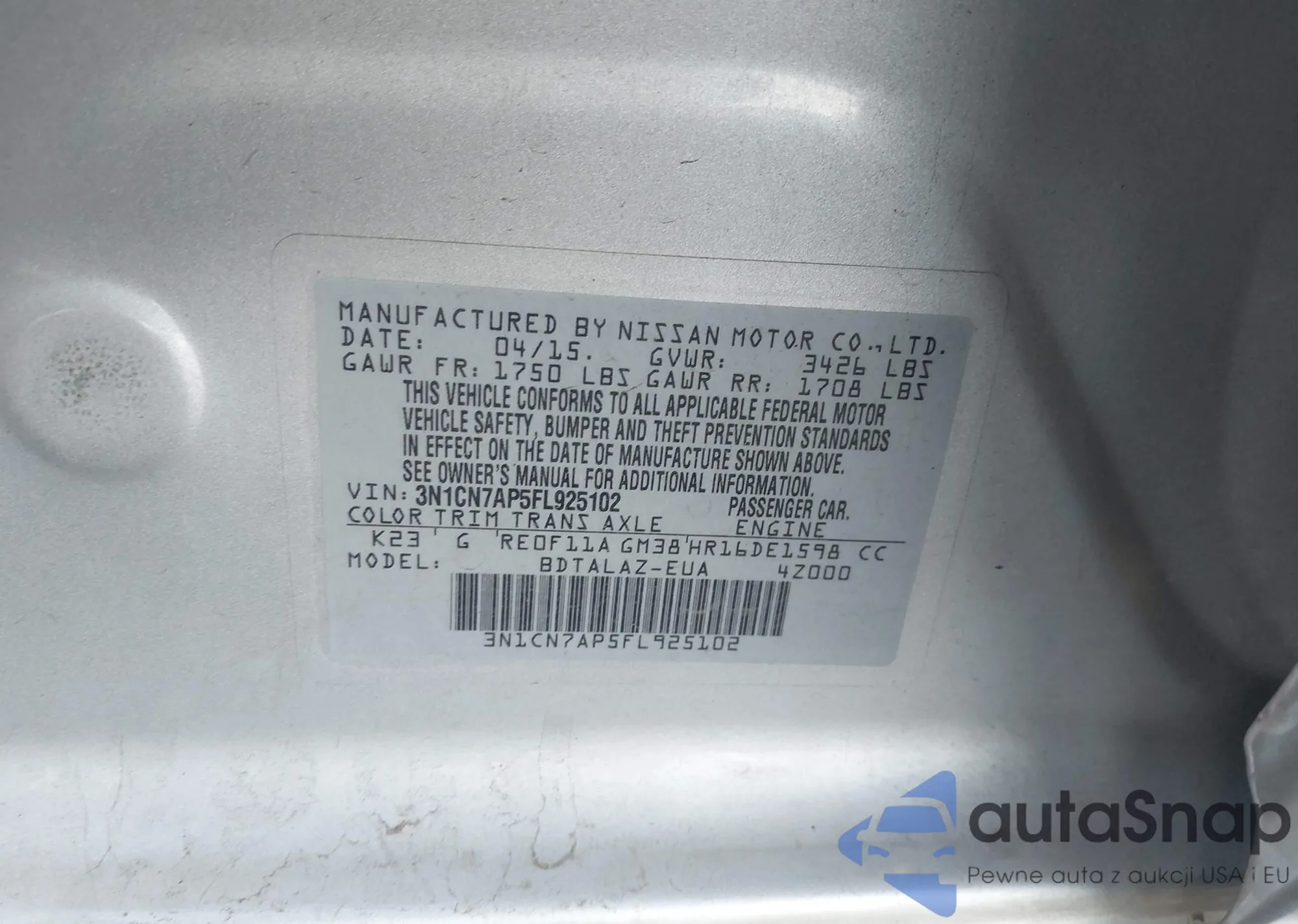 VIN: 3N1CN7AP5FL925102