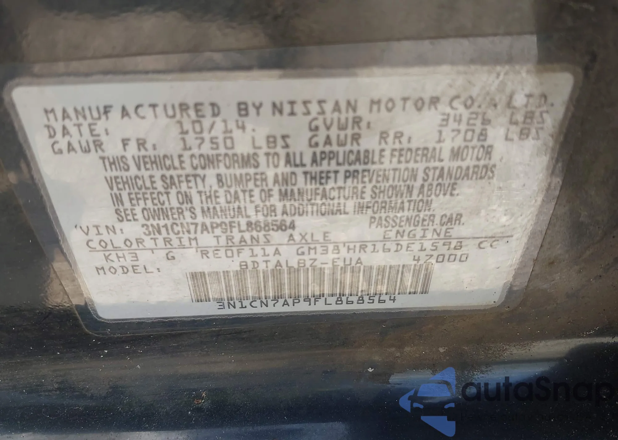 VIN: 3N1CN7AP9FL868564
