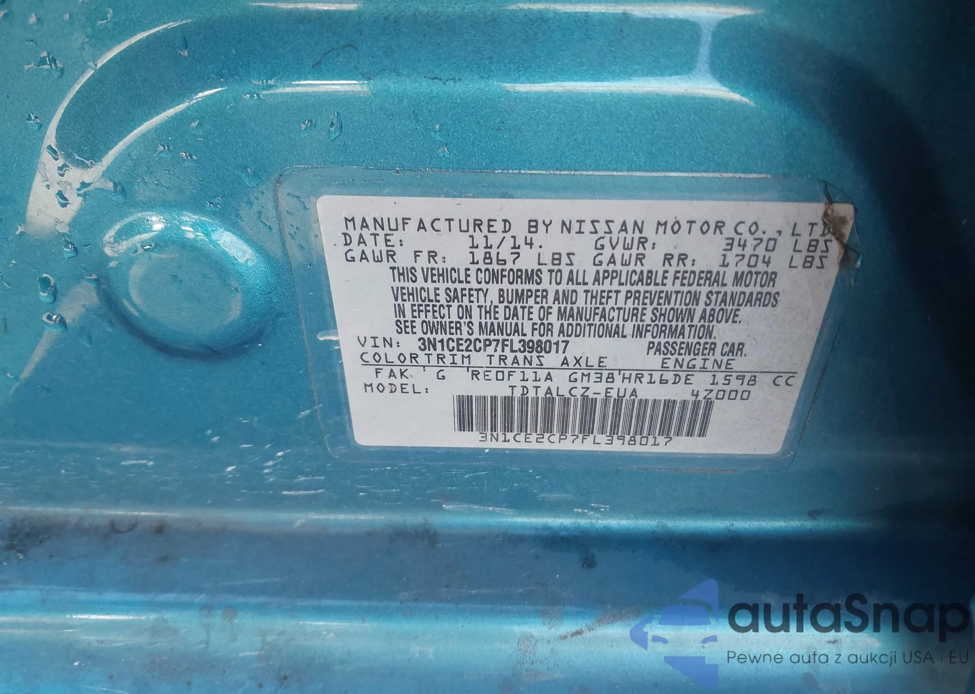 Автомобиль Nissan Versa 2015 (VIN 3N1CE2CP7FL398017) ранее не участвовал в торгах. Документы чистые, пробег соответствует или ниже среднего по рынку. Продаётся страховой компанией — рекомендуем покупку. Доставка в порт займет около 6–8 недель.