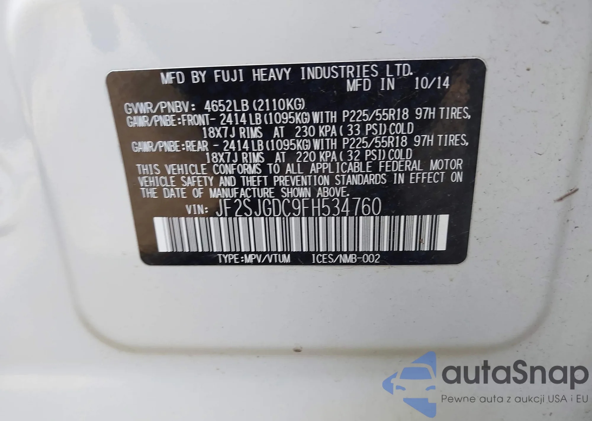 • VIN: JF2SJGDC9FH534760