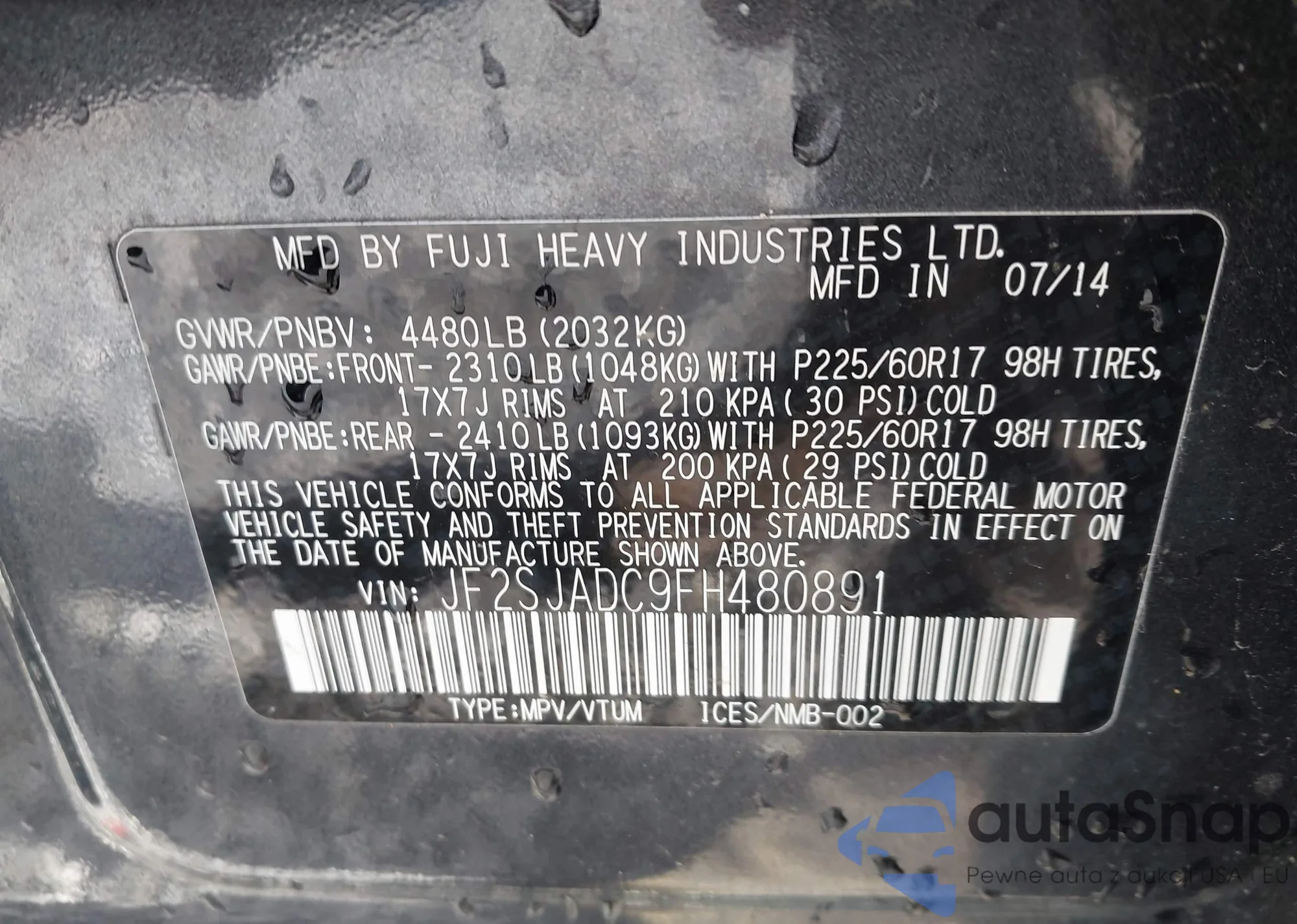 • VIN: JF2SJADC9FH480891