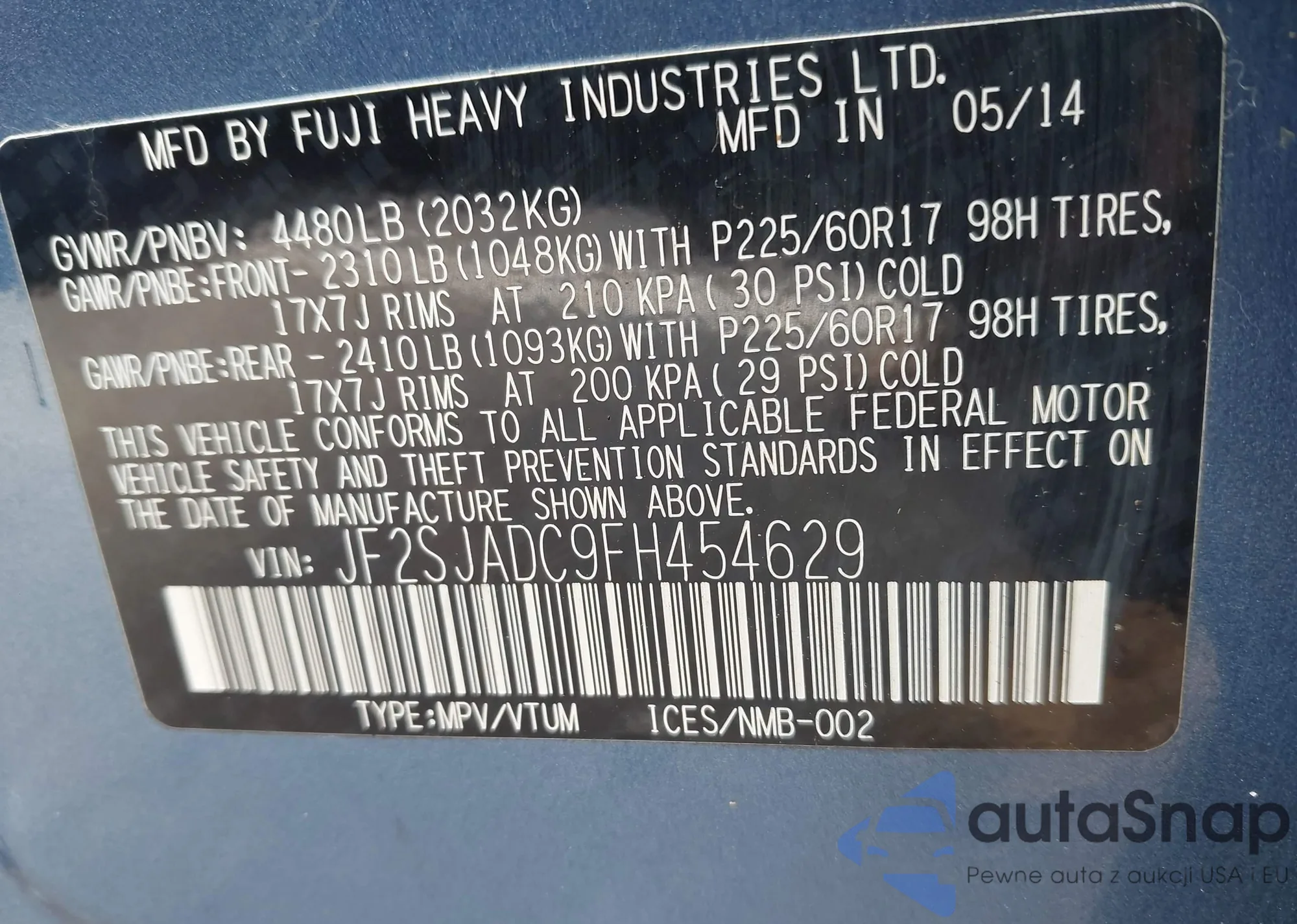 VIN: JF2SJADC9FH454629