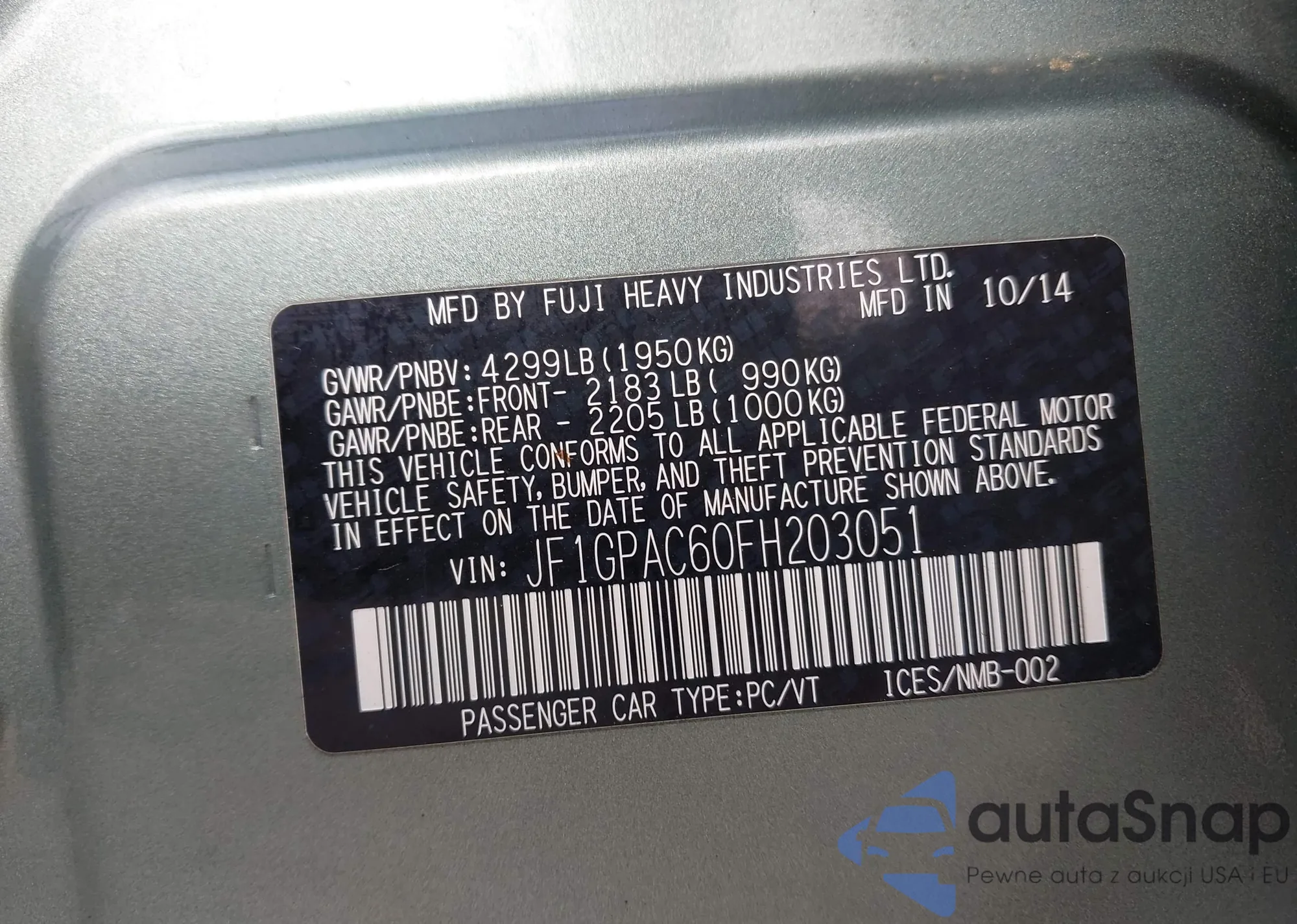 Автомобиль Subaru Impreza 2015 (VIN JF1GPAC60FH203051) ранее не участвовал в торгах. Документы чистые, пробег соответствует или ниже среднего по рынку. Продаётся страховой компанией — рекомендуем покупку. Доставка в порт займет около 6–8 недель.