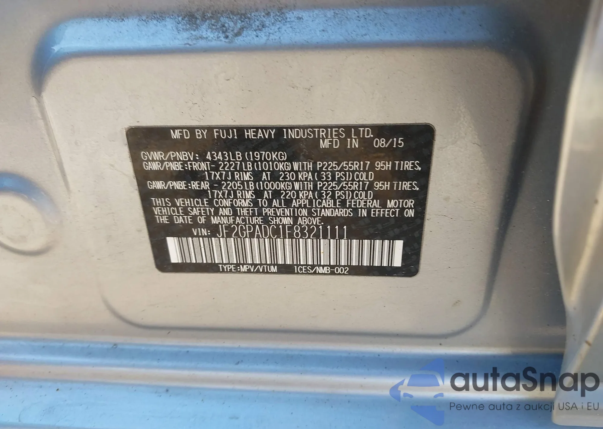 Автомобиль Subaru XV 2015 (VIN JF2GPADC1F8321111) ранее не участвовал в торгах. Документы чистые, пробег соответствует или ниже среднего по рынку. Продаётся страховой компанией — рекомендуем покупку. Доставка в порт займет около 6–8 недель.