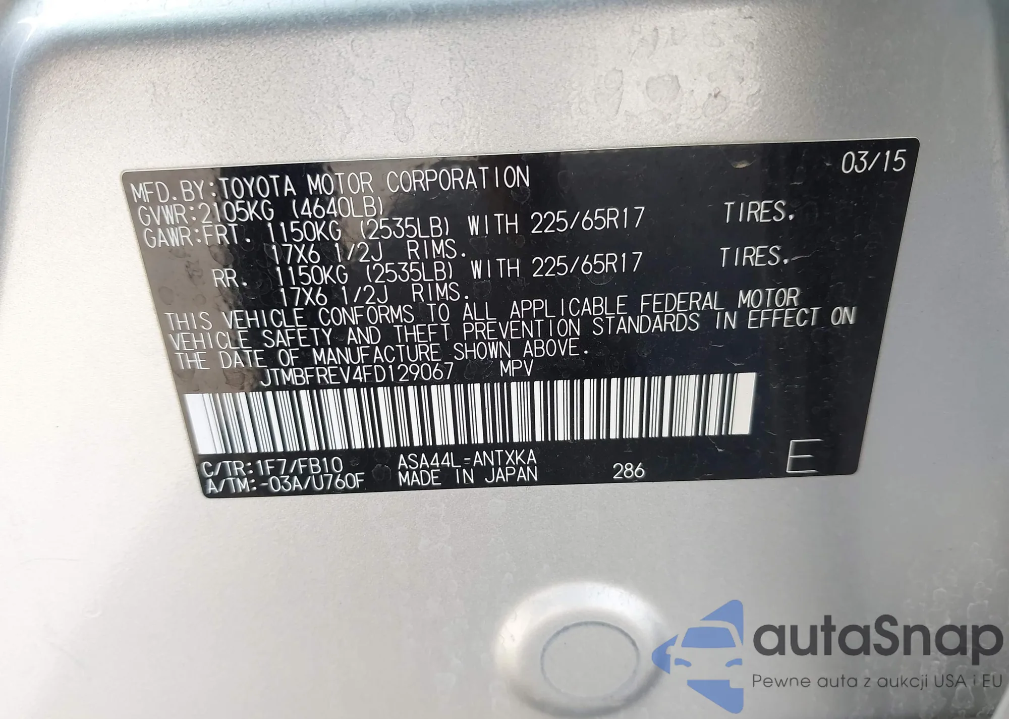 Автомобиль Toyota RAV 4 2015 (VIN JTMBFREV4FD129067) ранее не участвовал в торгах. Документы чистые, пробег соответствует или ниже среднего по рынку. Продаётся страховой компанией — рекомендуем покупку. Доставка в порт займет около 6–8 недель.