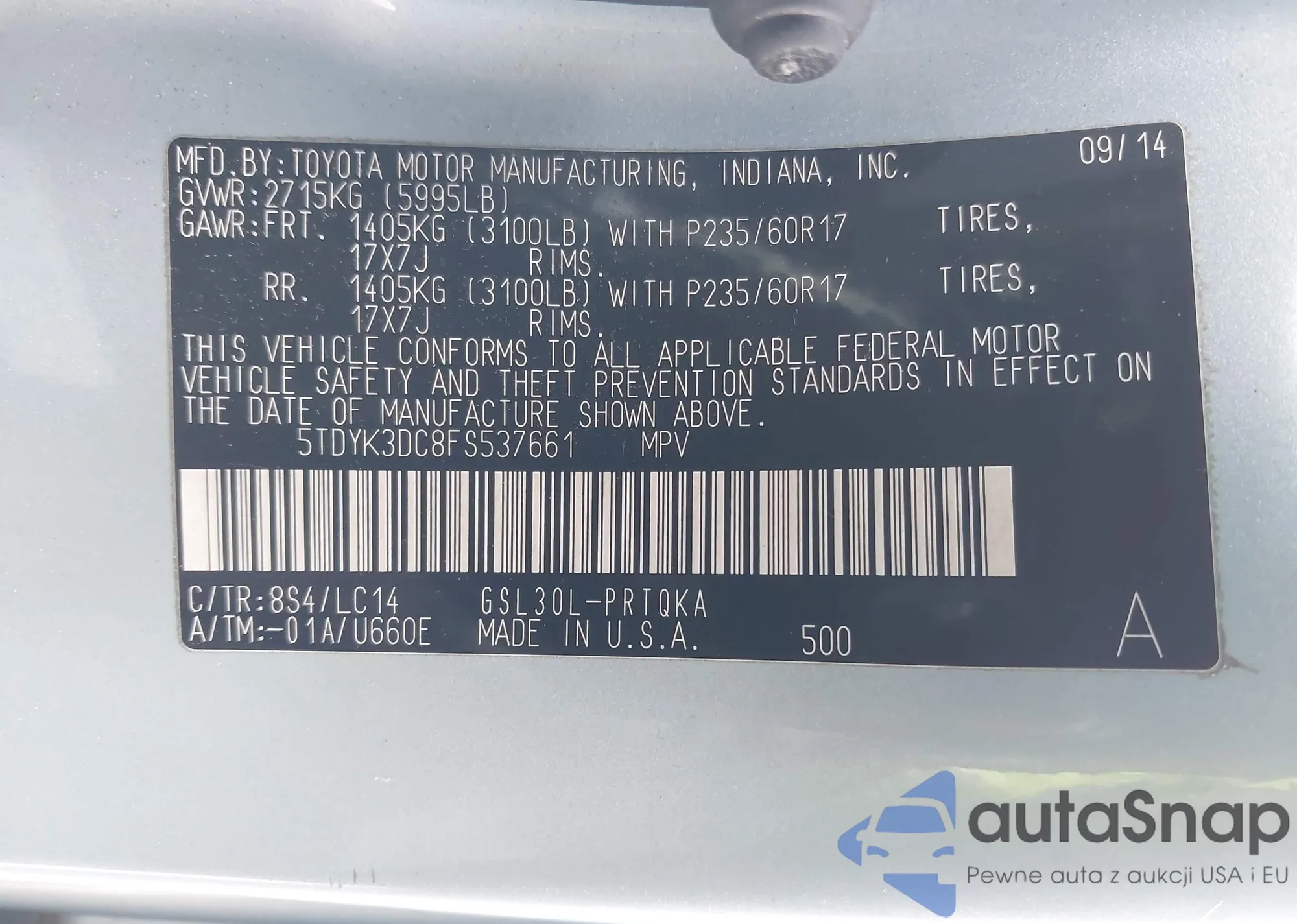 Автомобиль Toyota Sienna 2015 (VIN 5TDYK3DC8FS537661) ранее не участвовал в торгах. Документы чистые, пробег соответствует или ниже среднего по рынку. Продаётся страховой компанией — рекомендуем покупку. Доставка в порт займет около 6–8 недель.