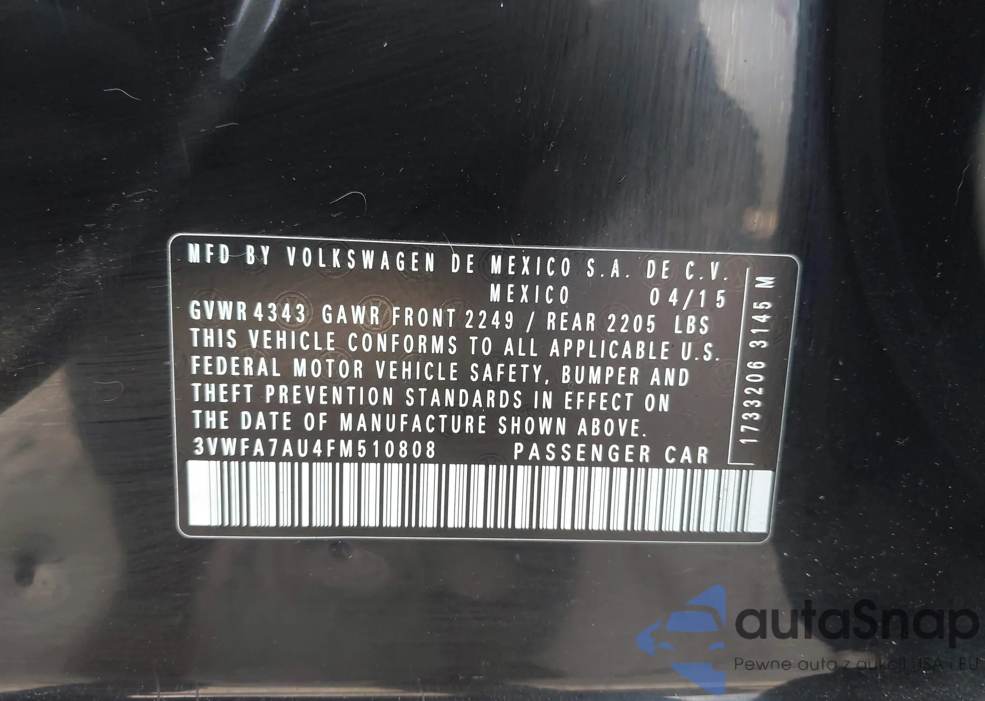 VIN: 3VWFA7AU4FM510808