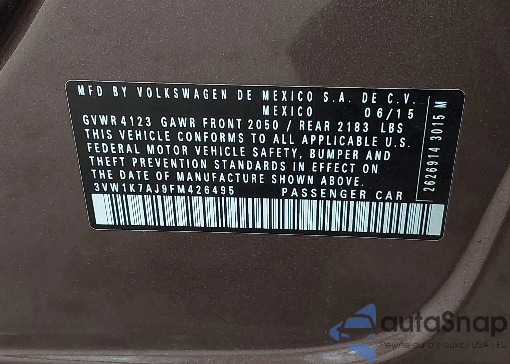 Автомобиль Volkswagen Jetta 2015 (VIN 3VW1K7AJ9FM426495) имеет документы, препятствующие регистрации. Могут возникнуть сложности при экспорте и регистрации. Обратитесь к экспертам AutaSnap для поиска альтернатив.