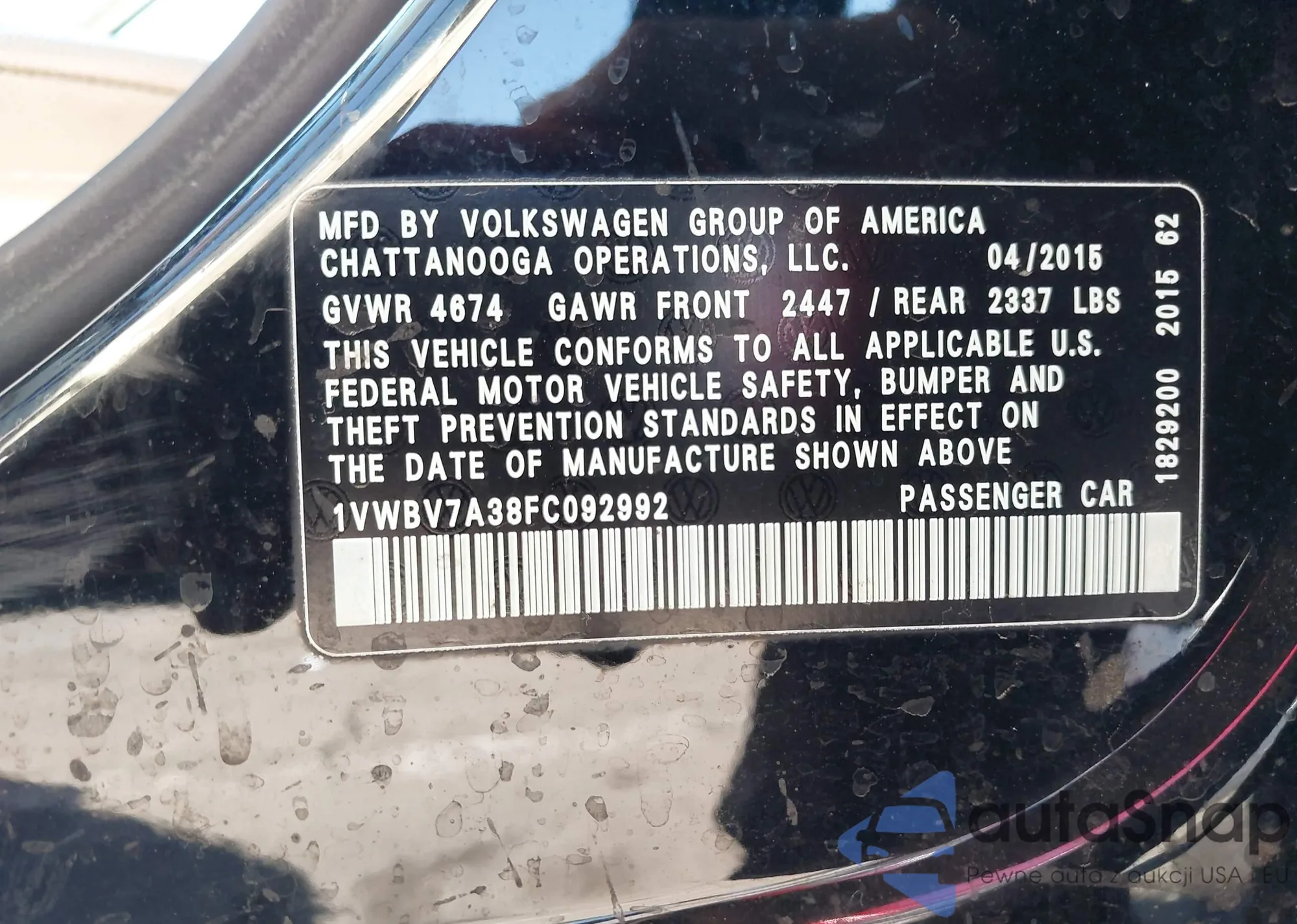 Автомобиль Volkswagen Passat 2015 (VIN 1VWBV7A38FC092992) ранее не участвовал в торгах. Документы чистые, пробег соответствует или ниже среднего по рынку. Продаётся страховой компанией — рекомендуем покупку. Доставка в порт займет около 6–8 недель.