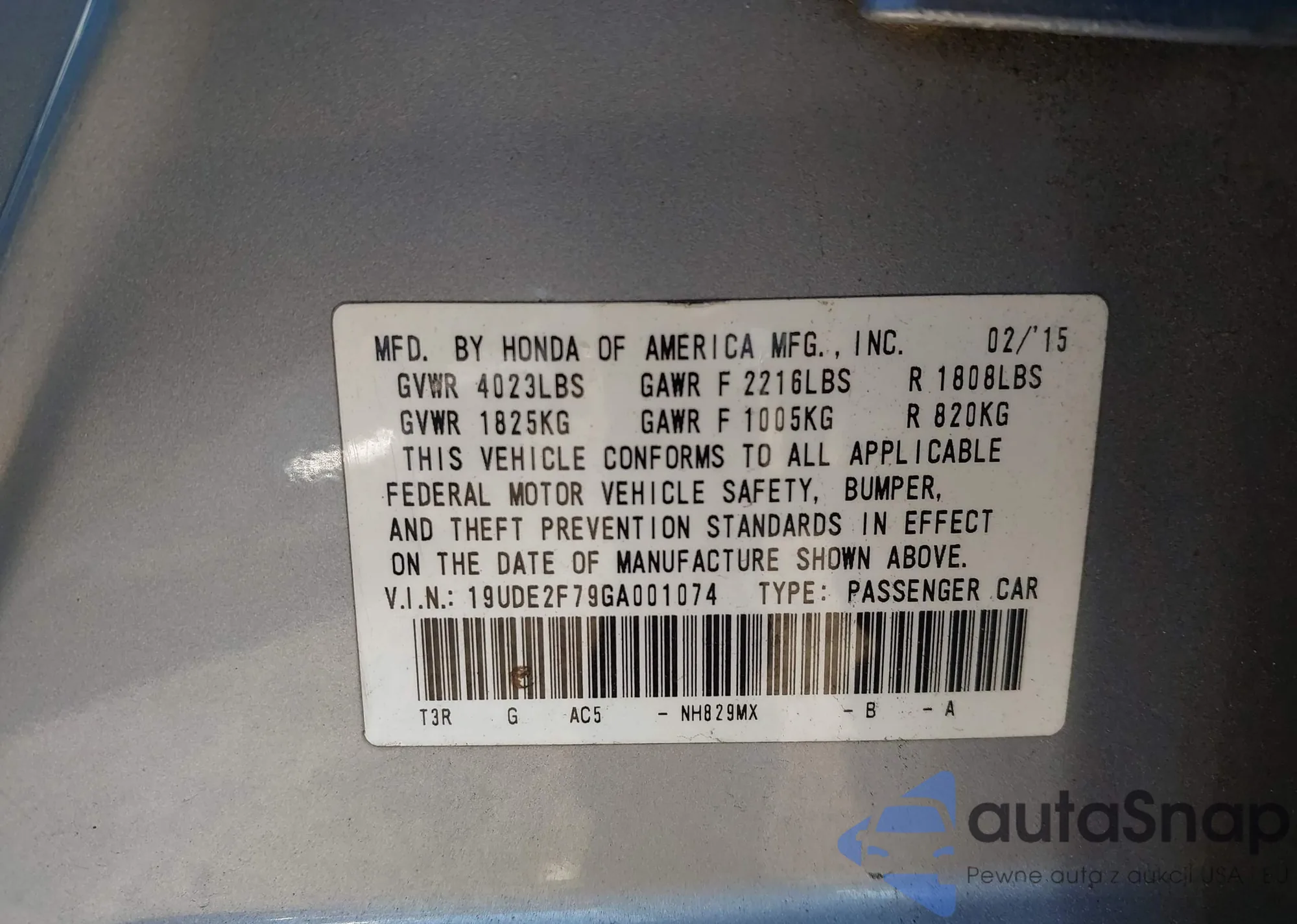 • VIN: 19UDE2F79GA001074