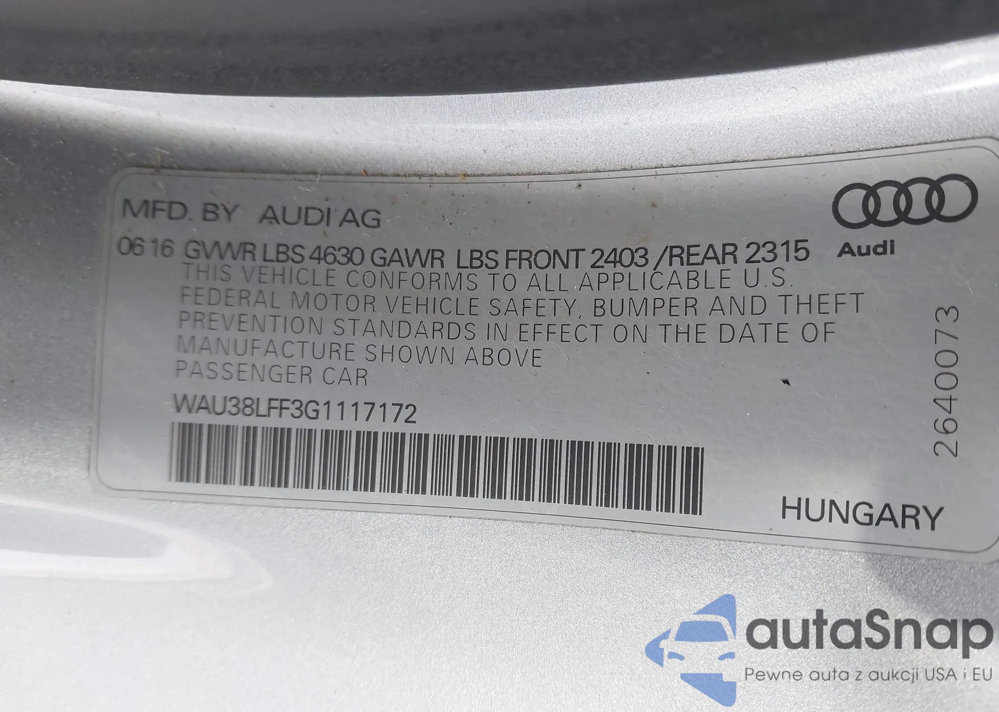 Автомобиль Audi A3 2016 (VIN WAU38LFF3G1117172) ранее не участвовал в торгах. Документы чистые, пробег соответствует или ниже среднего по рынку. Продаётся страховой компанией — рекомендуем покупку. Доставка в порт займет около 6–8 недель.