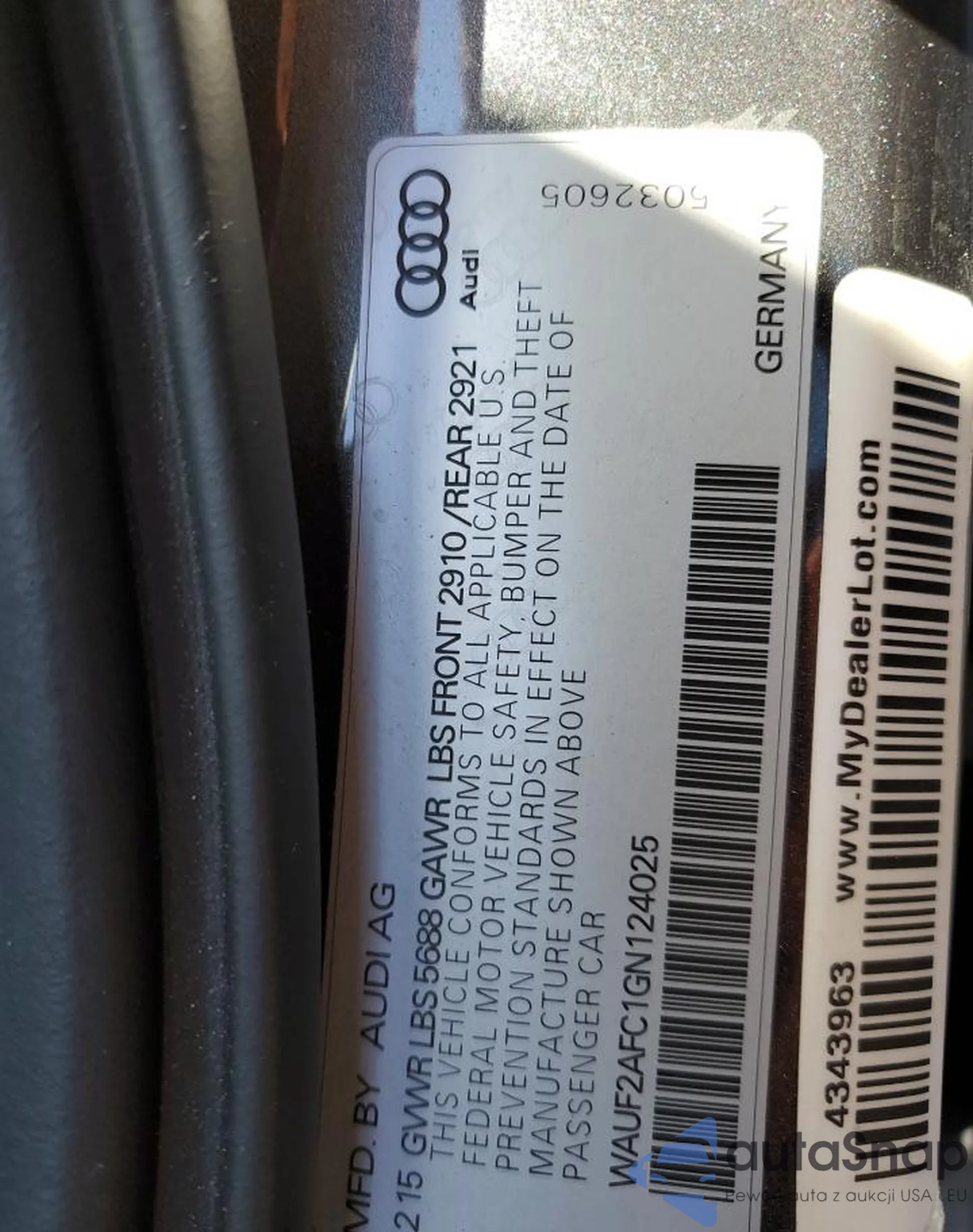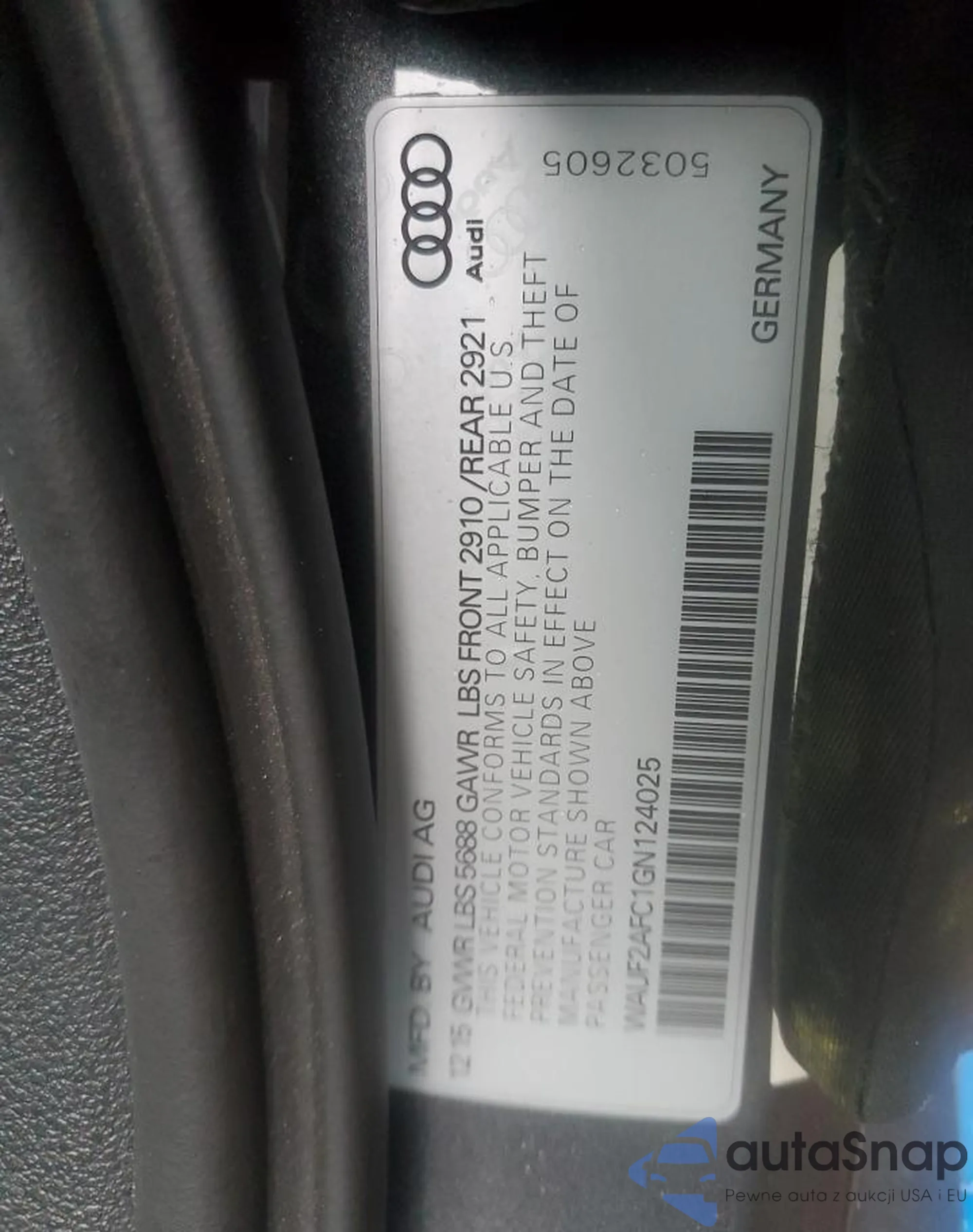 Автомобиль Audi S6 2016 (VIN WAUF2AFC1GN124025) имеет документы, препятствующие регистрации. Могут возникнуть сложности при экспорте и регистрации. Обратитесь к экспертам AutaSnap для поиска альтернатив.