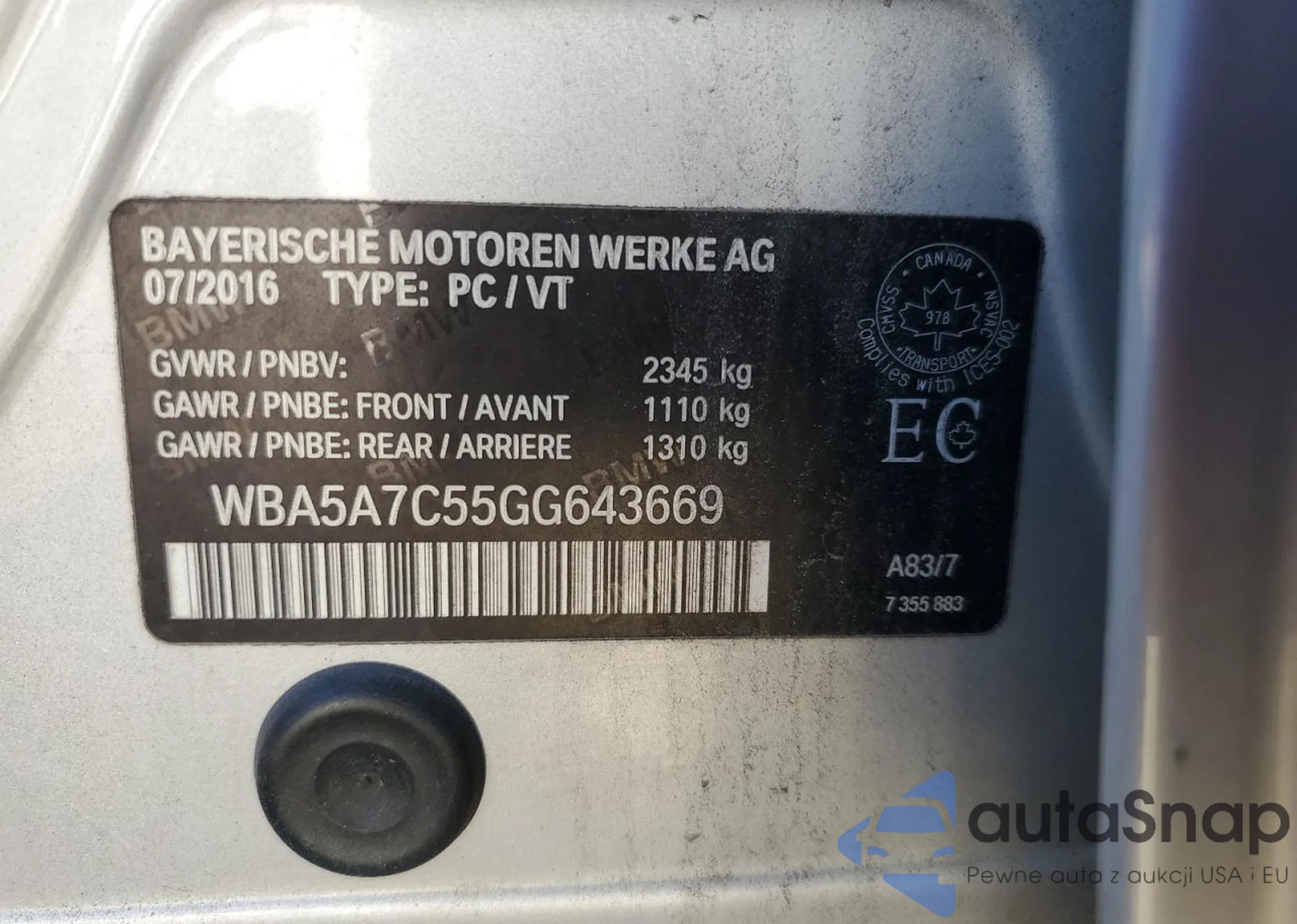 VIN: WBA5A7C55GG643669