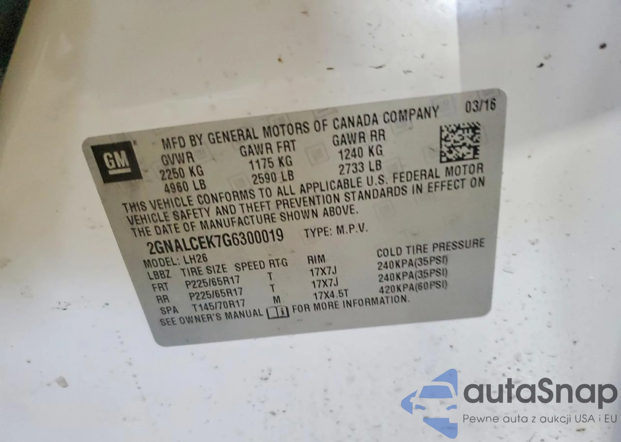 Автомобиль Chevrolet Equinox 2016 (VIN 2GNALCEK7G6300019) имеет документы, препятствующие регистрации. Могут возникнуть сложности при экспорте и регистрации. Обратитесь к экспертам AutaSnap для поиска альтернатив.
