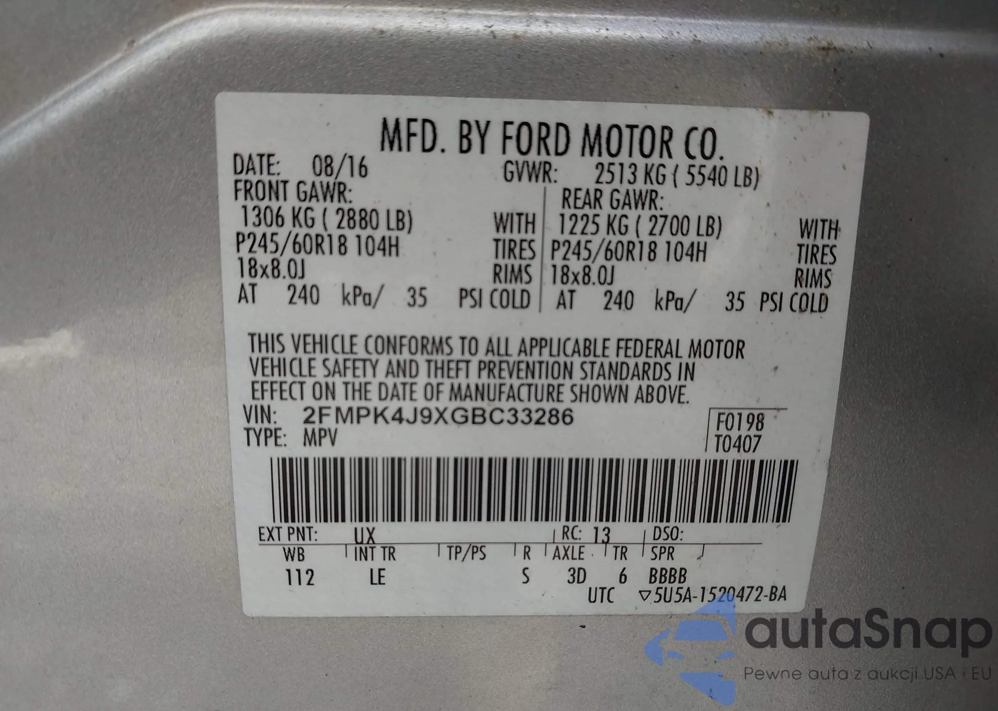 • VIN: 2FMPK4J9XGBC33286