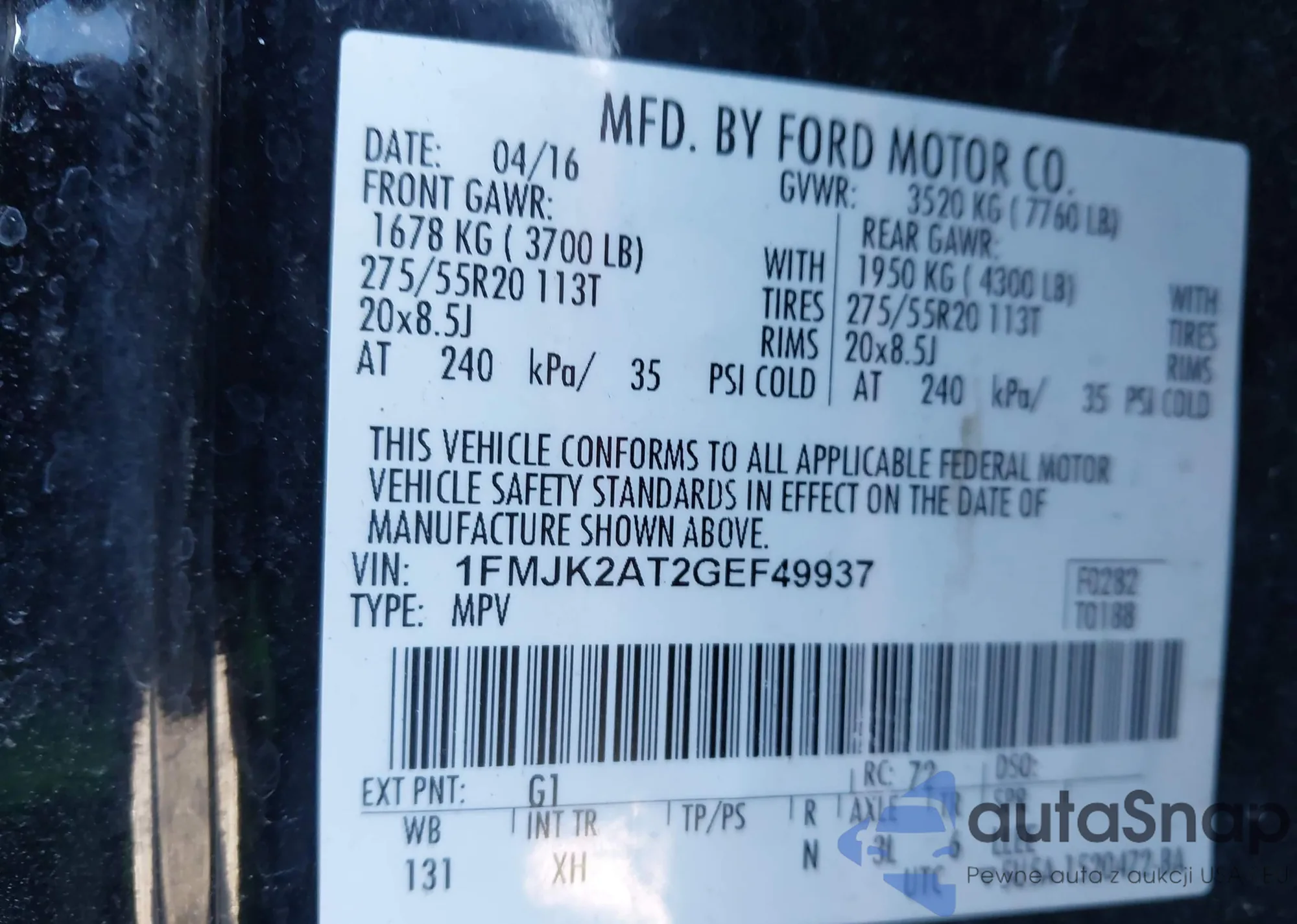 Автомобиль Ford Expedition 2016 (VIN 1FMJK2AT2GEF49937) ранее не участвовал в торгах. Документы чистые, пробег соответствует или ниже среднего по рынку. Продаётся страховой компанией — рекомендуем покупку. Доставка в порт займет около 6–8 недель.