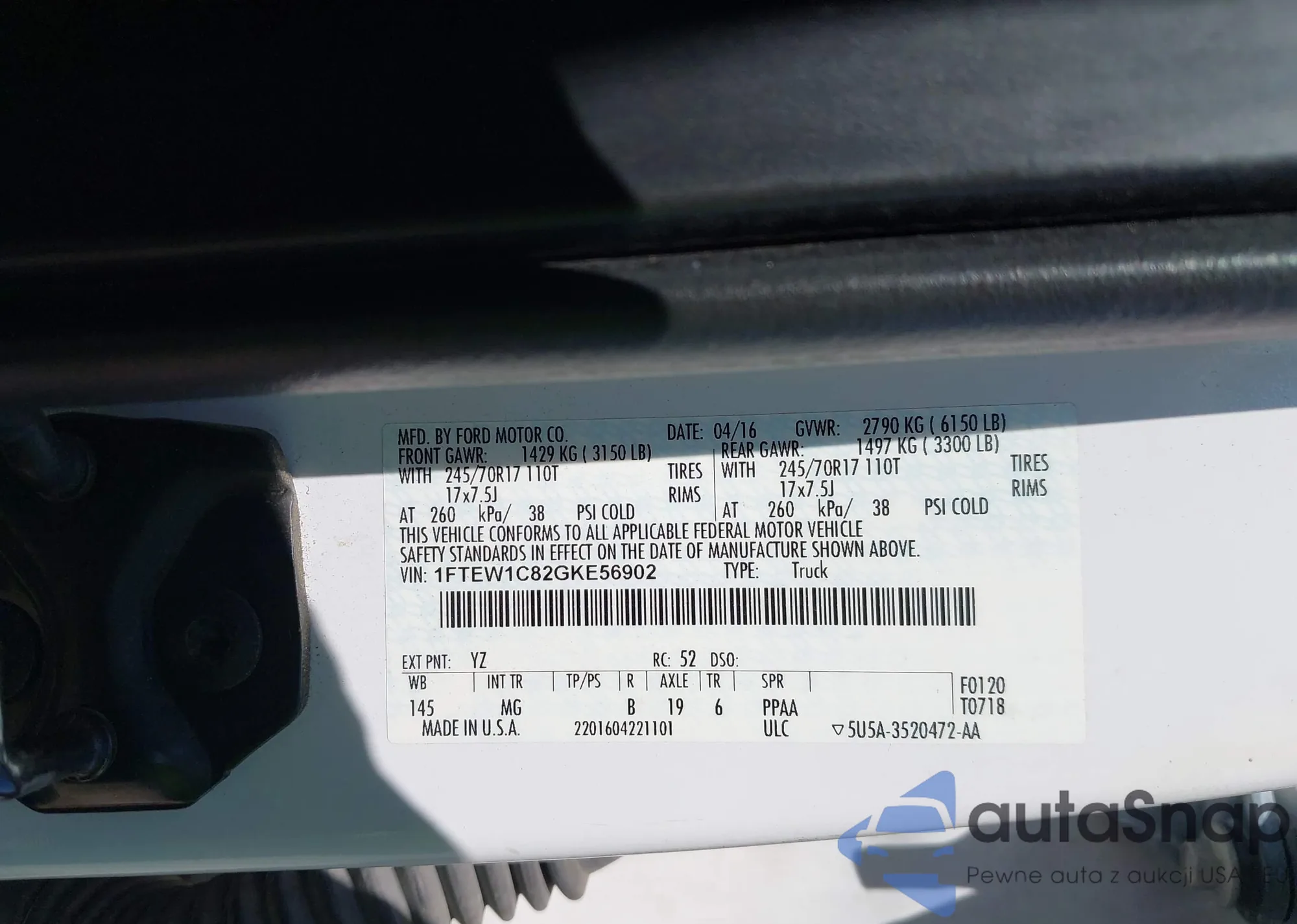 Автомобиль Ford F-150 2016 (VIN 1FTEW1C82GKE56902) ранее не участвовал в торгах. Документы чистые, пробег соответствует или ниже среднего по рынку. Продаётся страховой компанией — рекомендуем покупку. Доставка в порт займет около 6–8 недель.
