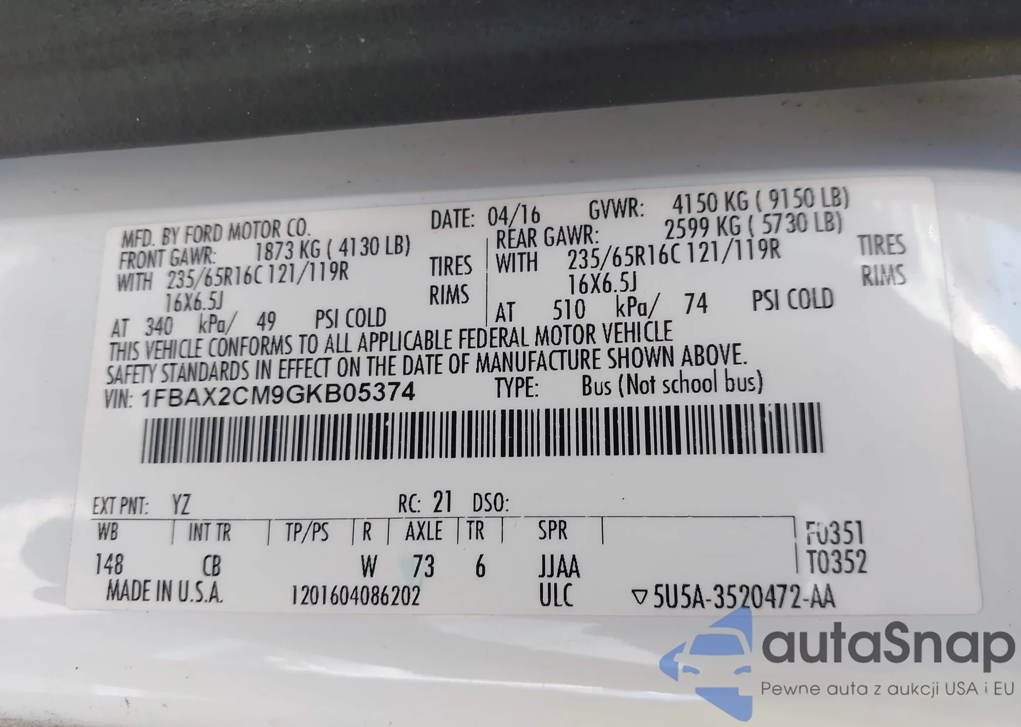 • VIN: 1FBAX2CM9GKB05374