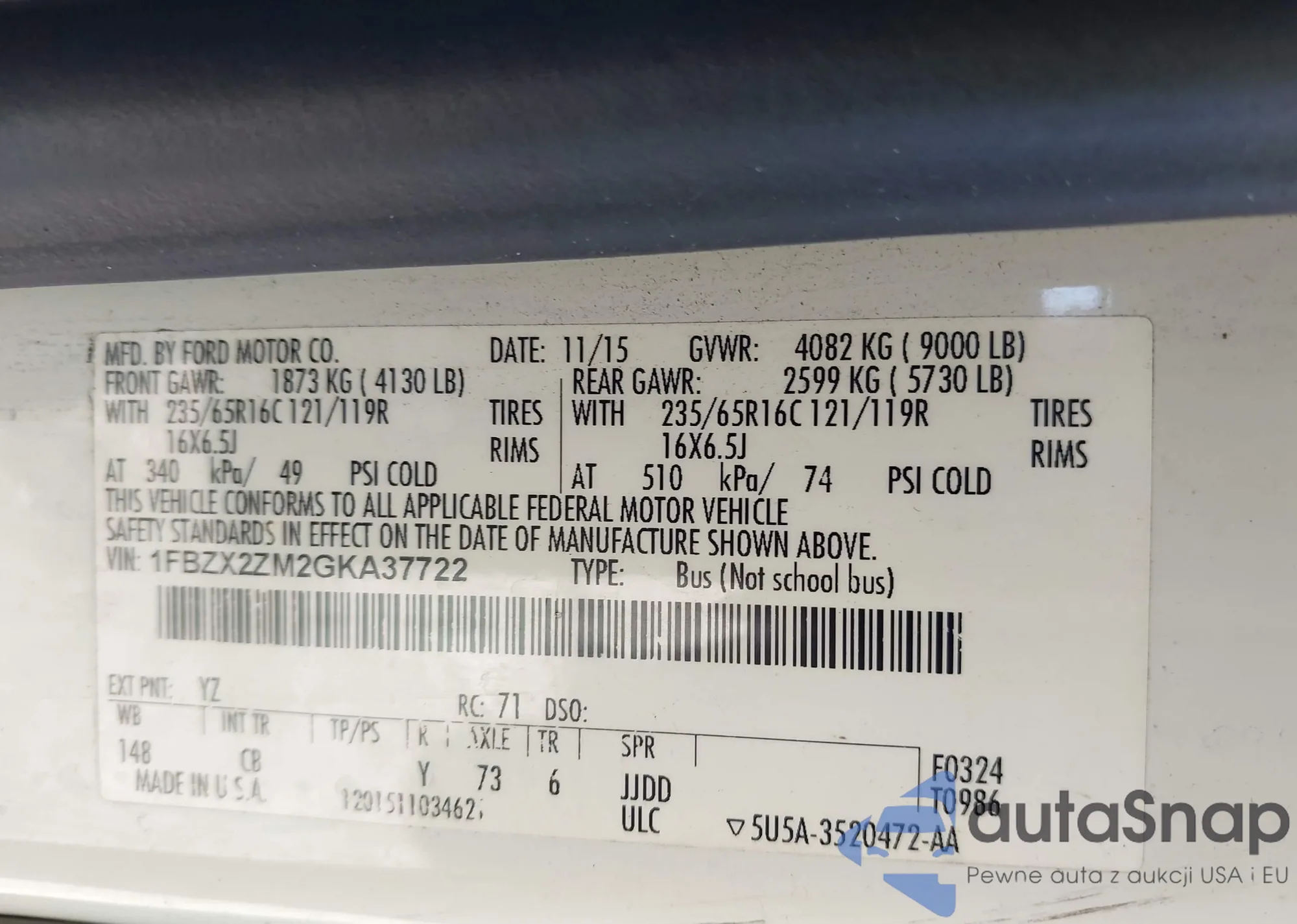 Автомобиль Ford Transit 2016 (VIN 1FBZX2ZM2GKA37722) ранее не участвовал в торгах. Документы чистые, пробег соответствует или ниже среднего по рынку. Продаётся страховой компанией — рекомендуем покупку. Доставка в порт займет около 6–8 недель.