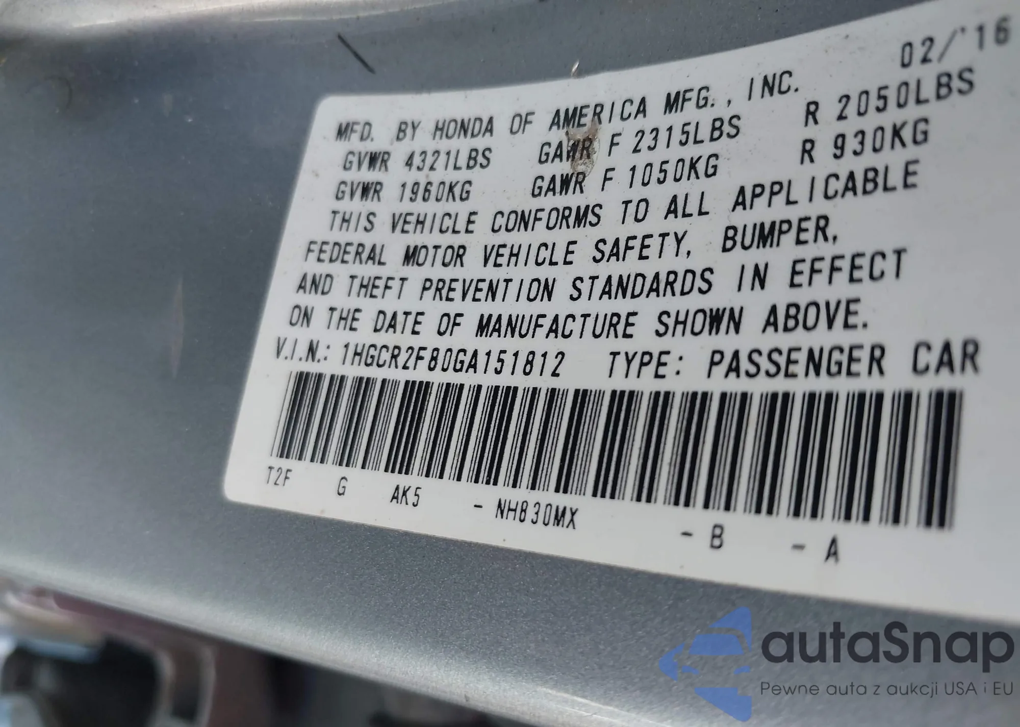 VIN: 1HGCR2F80GA151812