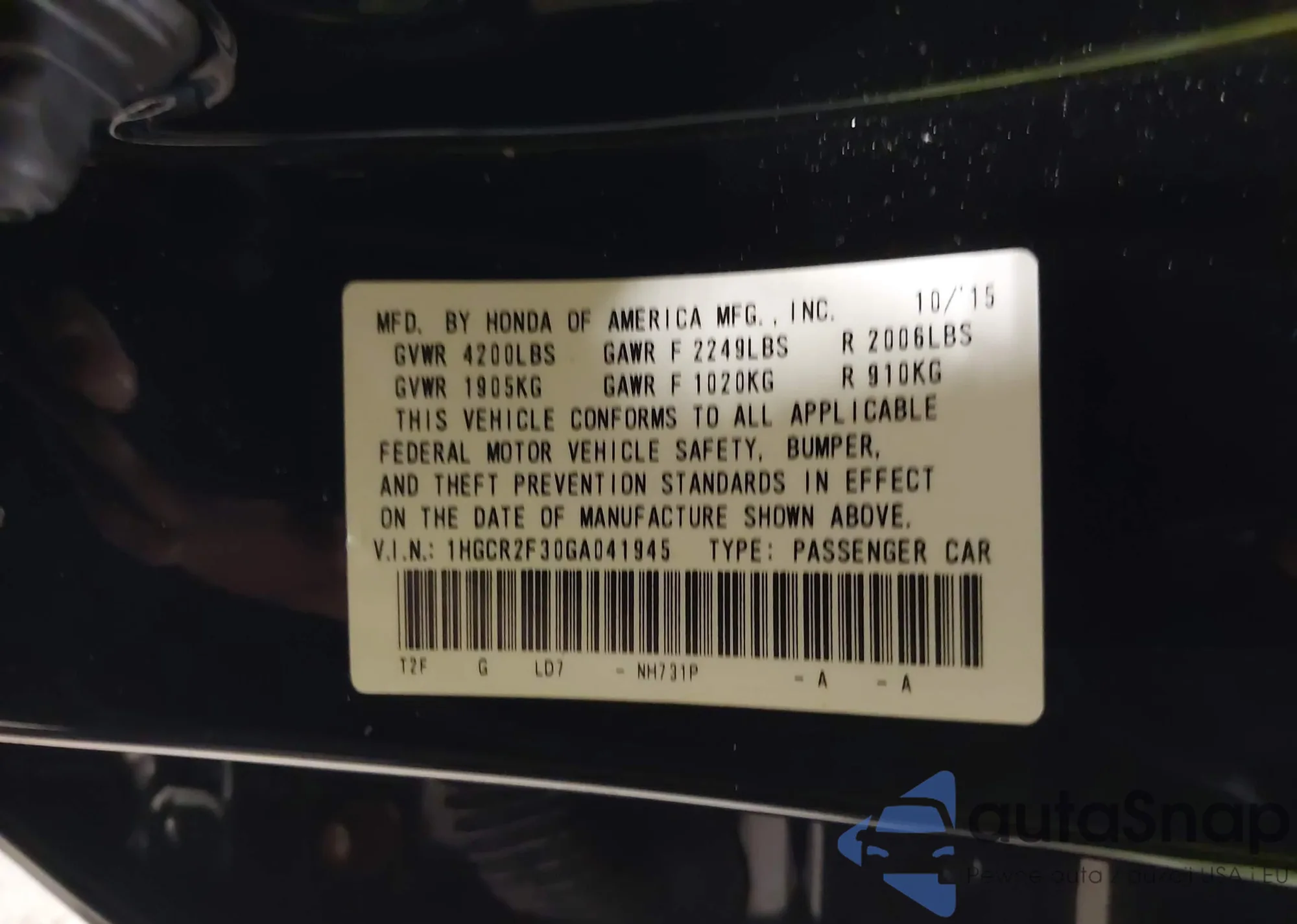 VIN: 1HGCR2F30GA041945