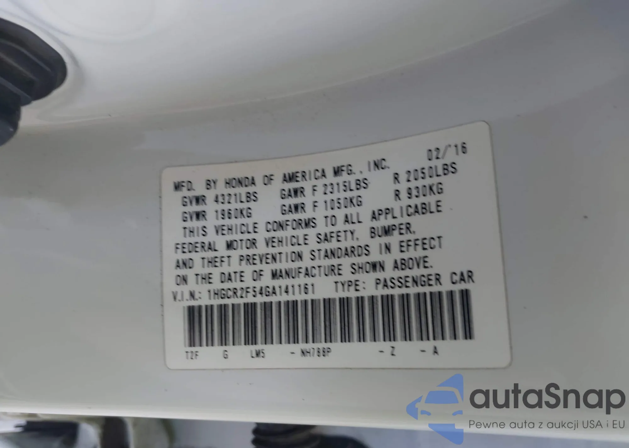 • VIN: 1HGCR2F54GA141161