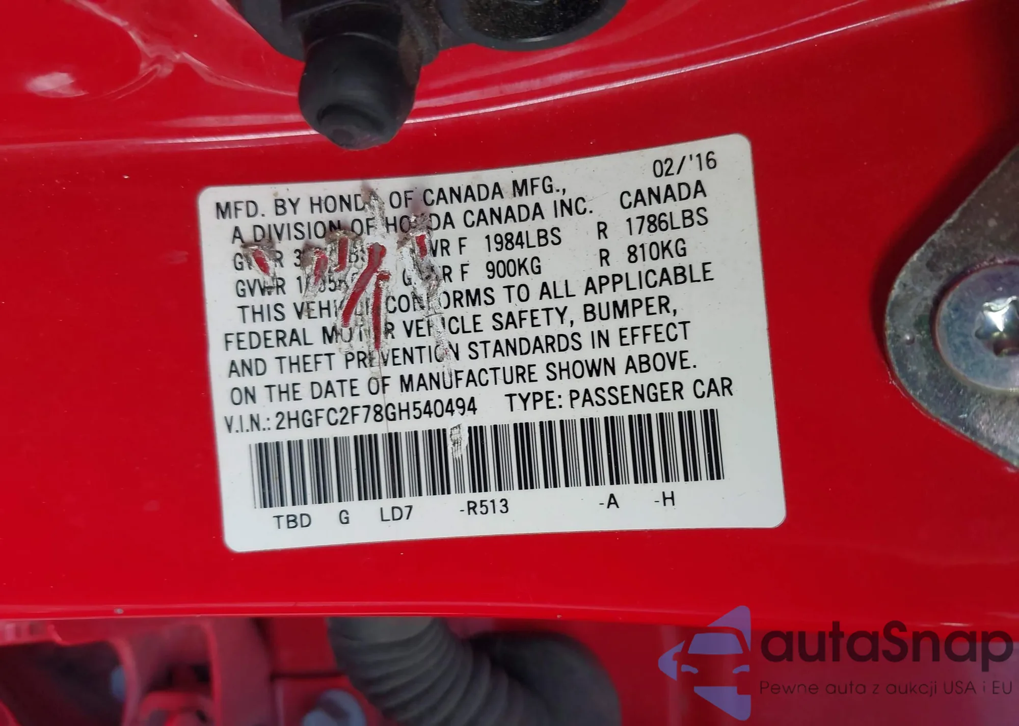 Автомобиль Honda Civic 2016 (VIN 2HGFC2F78GH540494) ранее не участвовал в торгах. Документы чистые, пробег соответствует или ниже среднего по рынку. Продаётся страховой компанией — рекомендуем покупку. Доставка в порт займет около 6–8 недель.