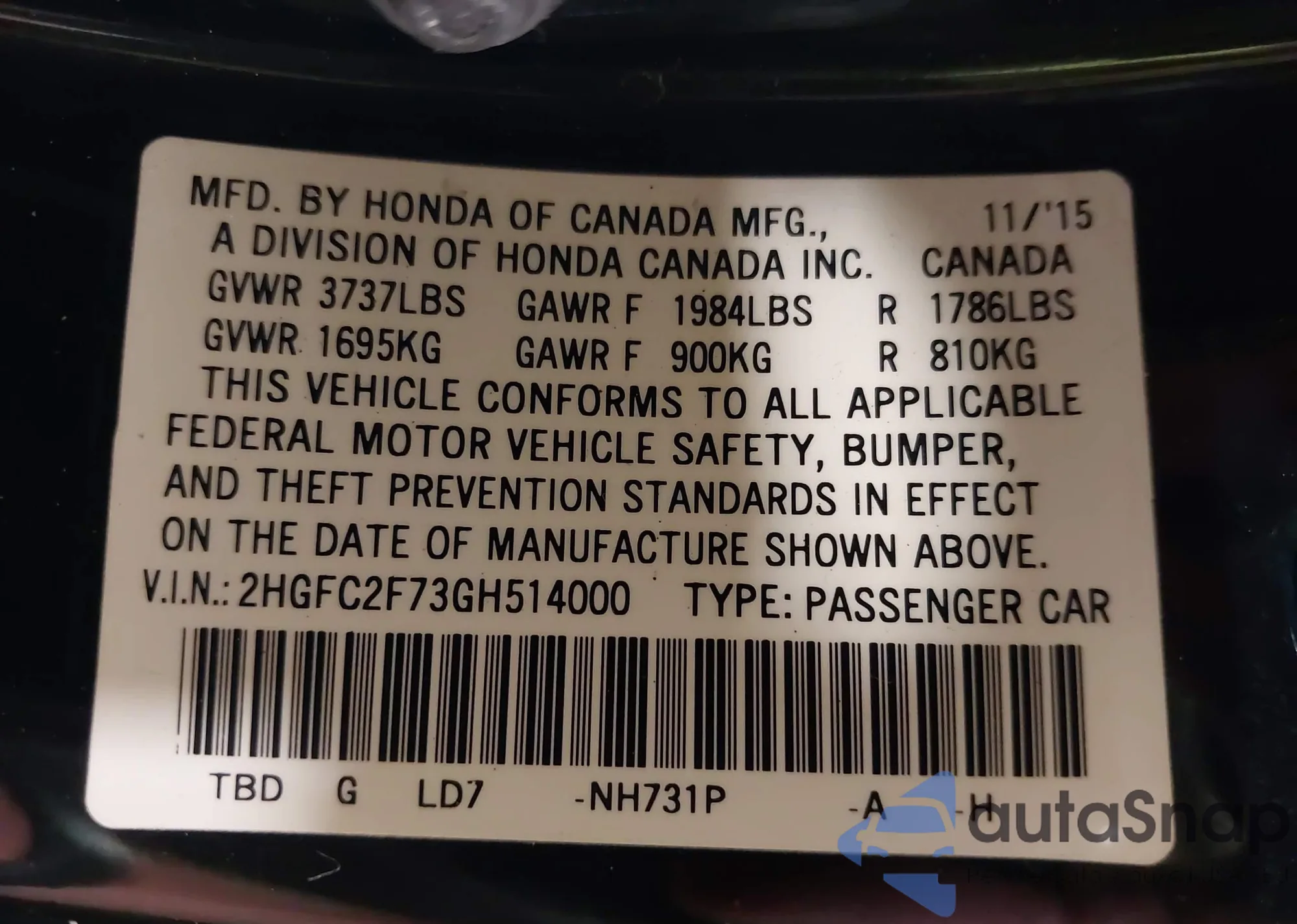 VIN: 2HGFC2F73GH514000
