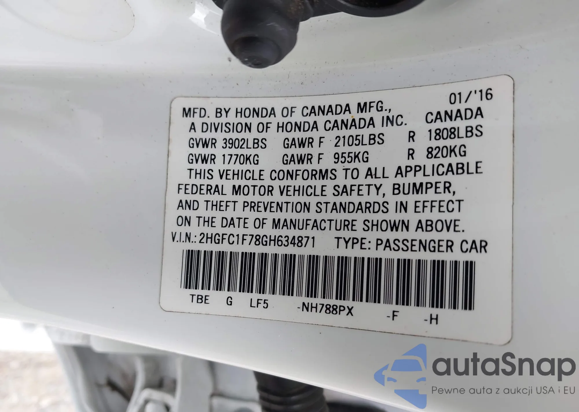 VIN: 2HGFC1F78GH634871