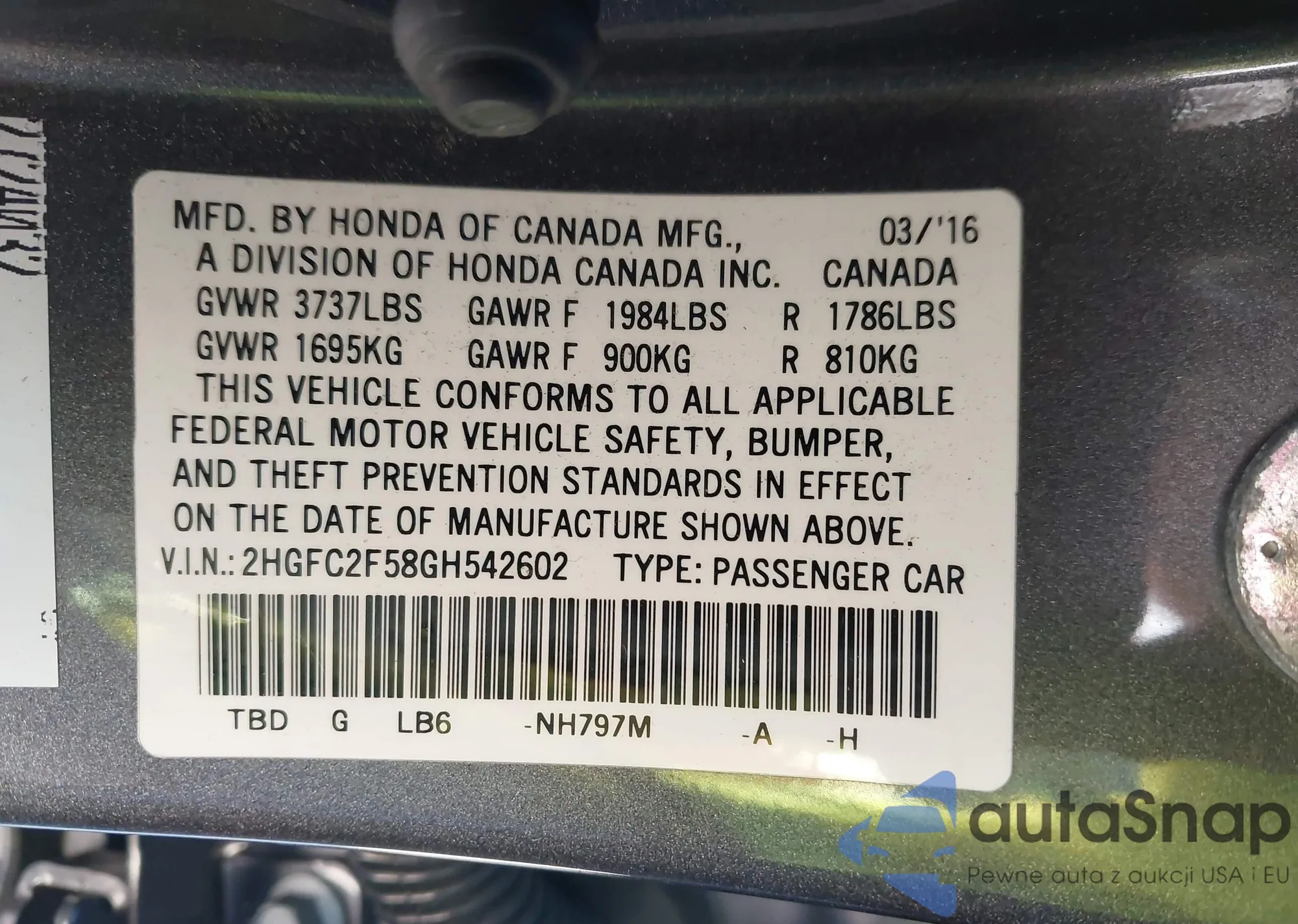 • VIN: 2HGFC2F58GH542602