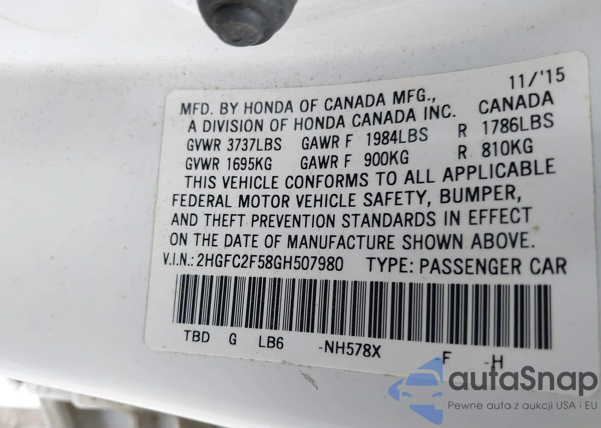 VIN: 2HGFC2F58GH507980