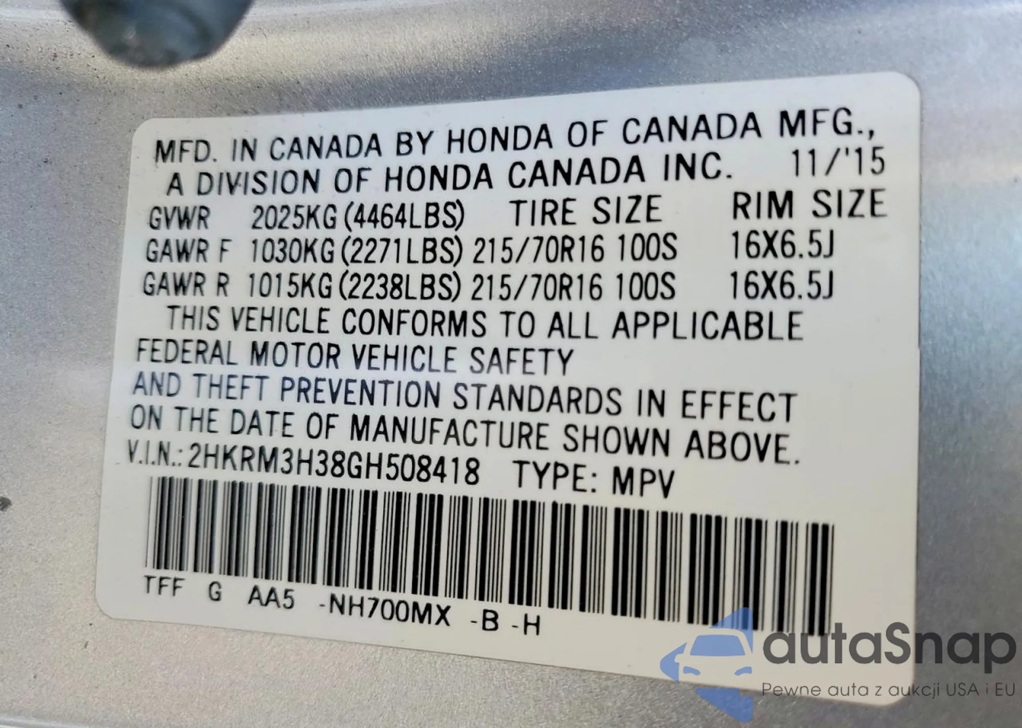 VIN: 2HKRM3H38GH508418