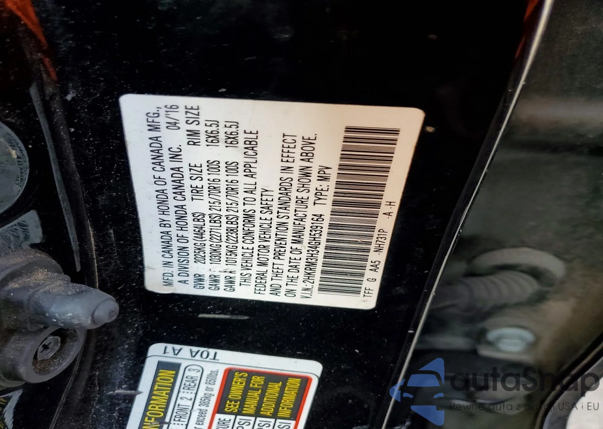 VIN: 2HKRM3H34GH539164
