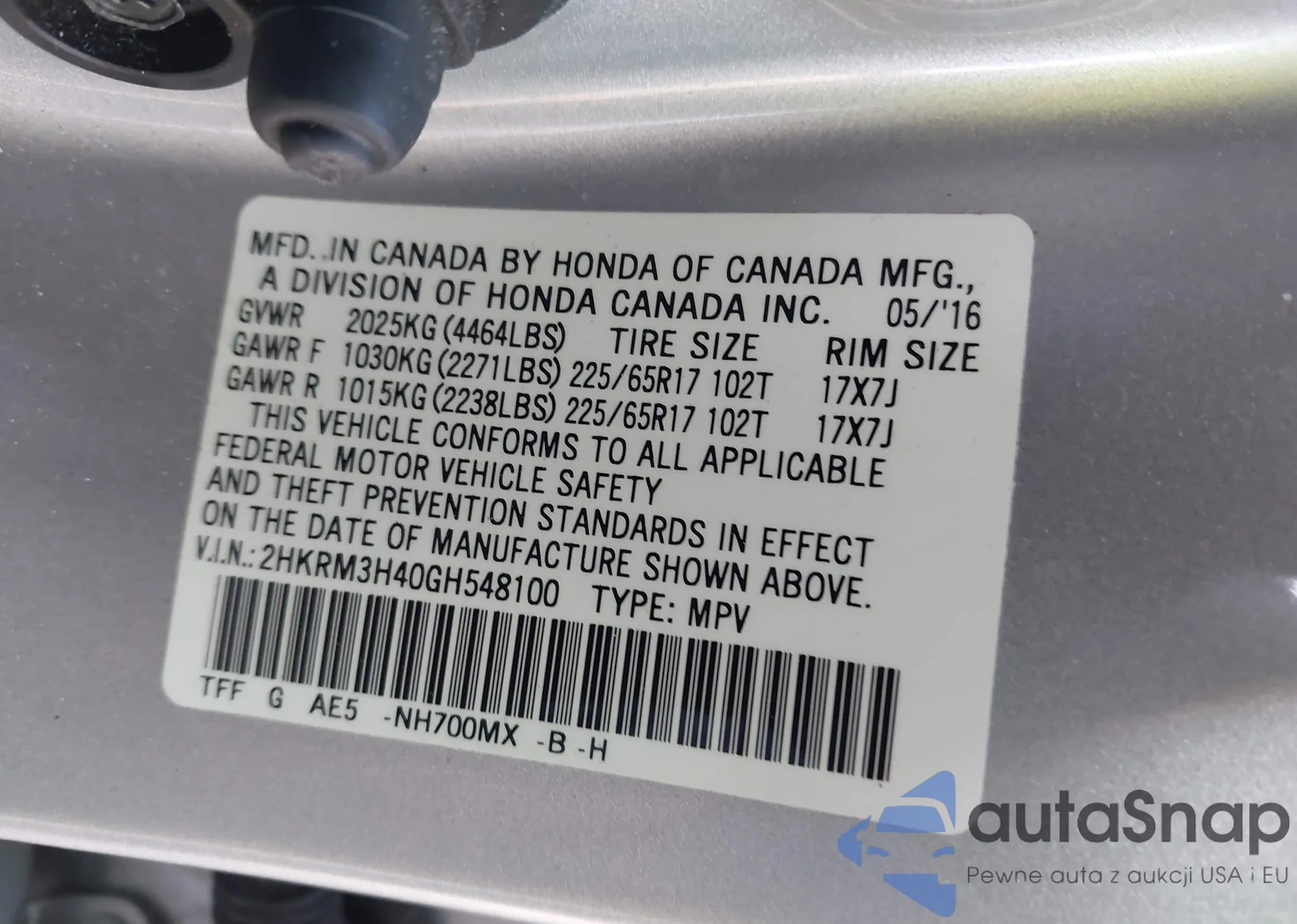 VIN: 2HKRM3H40GH548100