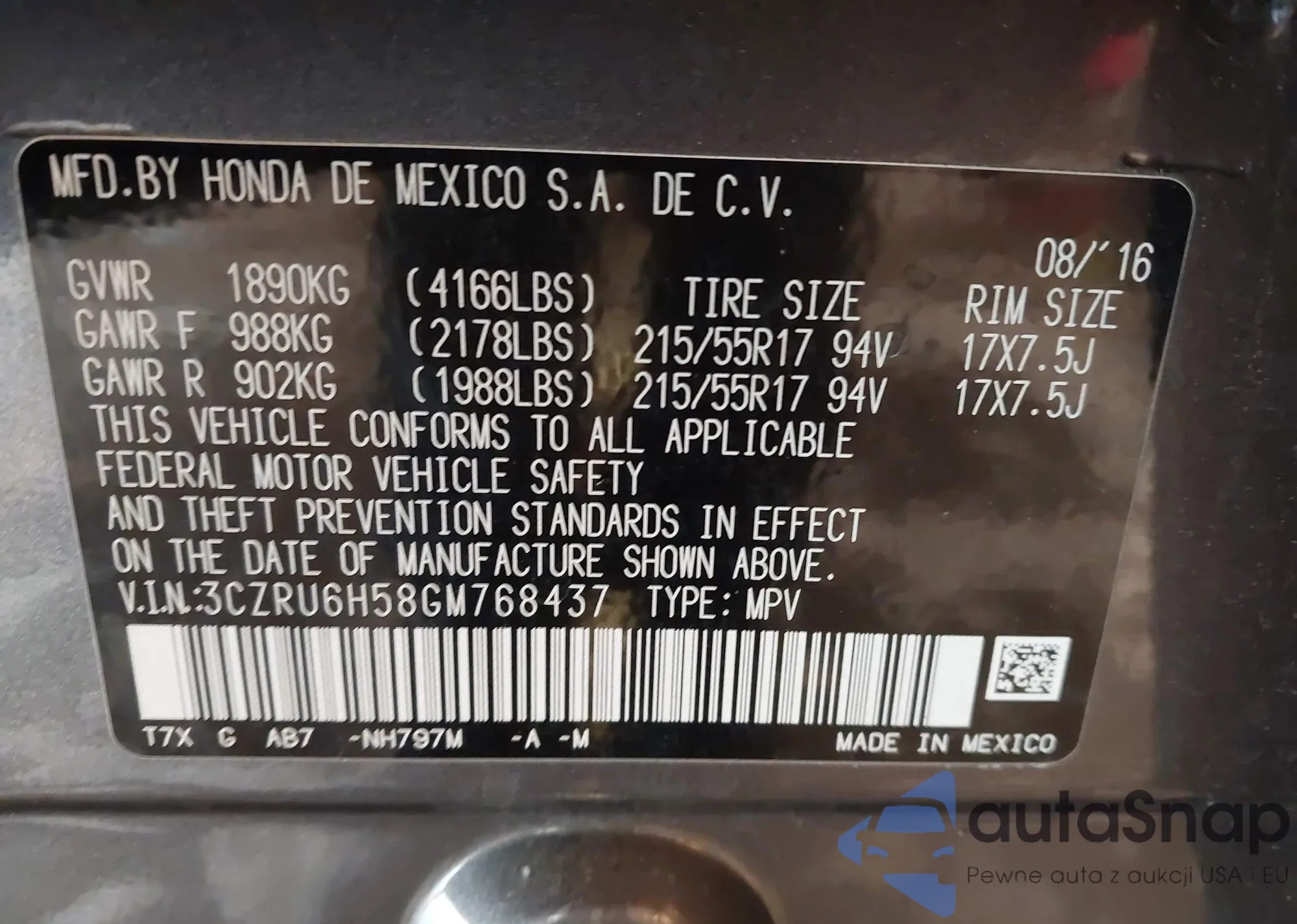 Автомобиль Honda HR-V 2016 (VIN 3CZRU6H58GM768437) ранее не участвовал в торгах. Документы чистые, пробег соответствует или ниже среднего по рынку. Продаётся страховой компанией — рекомендуем покупку. Доставка в порт займет около 6–8 недель.